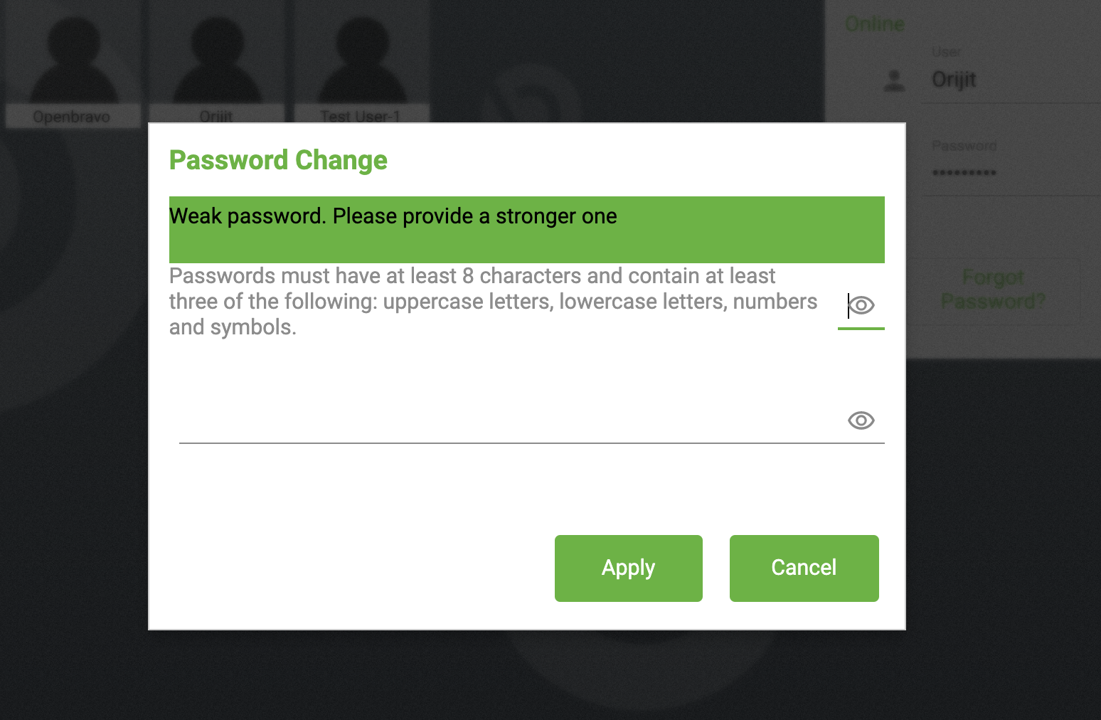 | Description | If the user tries to set up a weak password after using the "WebPOS Forgot Password" feature, an information message is shown and he cannot see the first password field. | |||||||