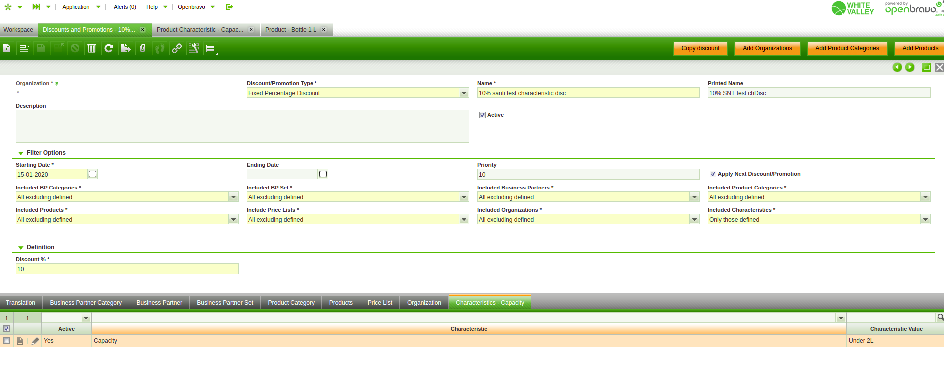 | Steps To Reproduce | * go to Openbravo livebuilds section Retail with module (pgsql link for back office, webpos for web POS) * Go to back office, change role to The White Valley Group Admin * create a new discount / promotion on window Discounts and Promotions. Organization = *, Discount/Promotion Type = Fixed Percentage Discount, Name = whatever test, Printed Name = whatever test, Starting Date = “today”, Priority = 10, Included Characteristics = Only those defined, Discount % = 10. On tab Characteristics create a new record: Active = Yes, Characteristic = Capacity, Characteristic Value = Under 2L. * go to Web POS, search for products, select Capacity, on the popup select Under 2L, add the first one to the ticket * the discount has not been applied * add the second one to the ticket * the discount is now applied to the product we added before only | |||||||