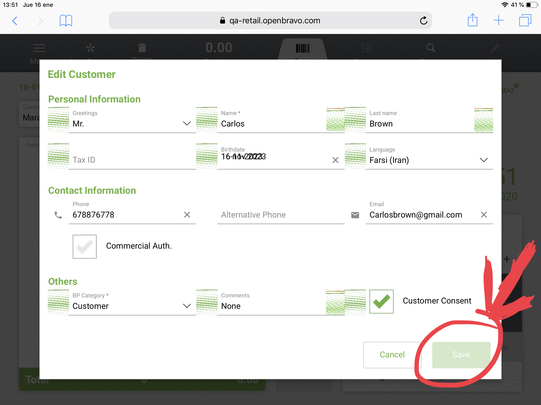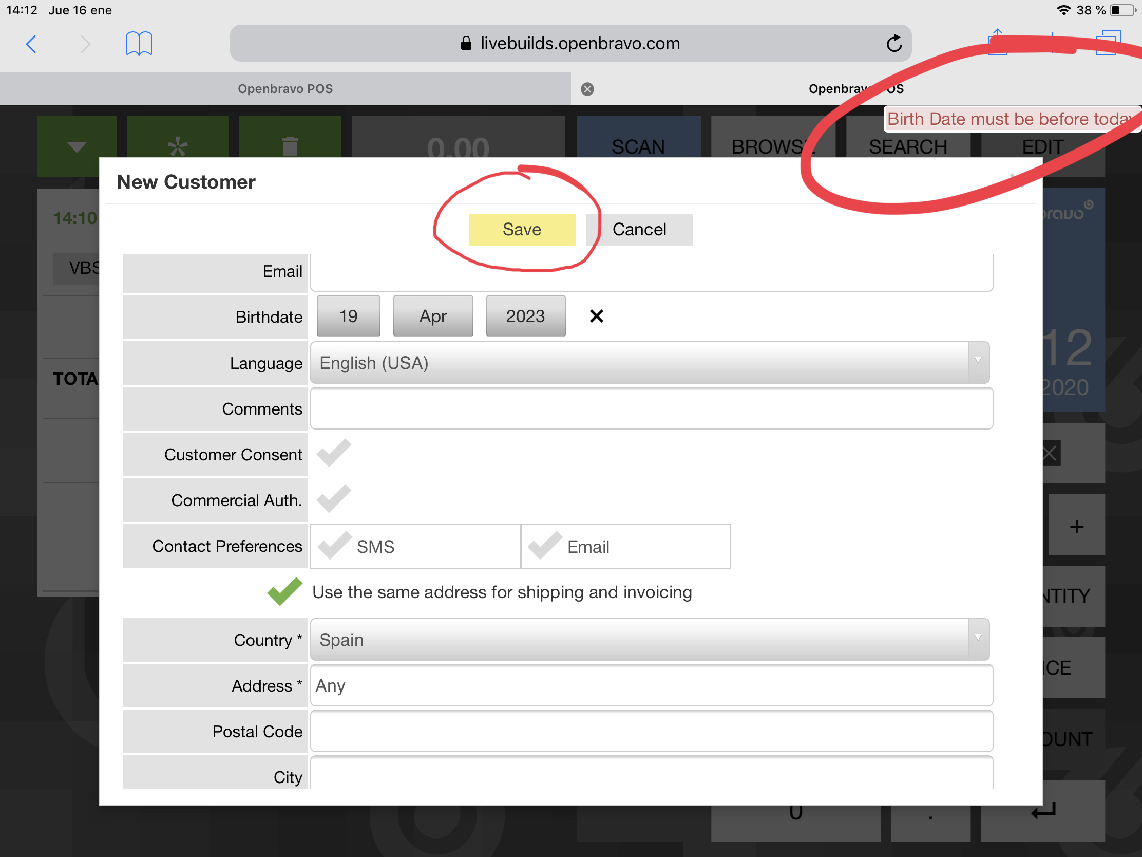 | Steps To Reproduce | 0-Login POS as vallblanca using iPad device. 1-Click Customer name and click then New Customer button. 2-Fill properly all mandatory fields. 3-Fill the Birthdate field with a later than today date. E.g. 01/01/2100. 4-Click "Save" button. DEFECT: Realise Save button is visually set as disabled. Note: reproduced in laptop Create new customer button Fill name Fill birth date with a date in the future E.g. 01/01/2100. Press save -> correct error -> addres is mandatory Fill adress Press Save -> correct error -> Birth should be > to present ERROR: Button save is now disabled and it does not change to enabled even if you change the birth date, however it works when you press it | |||||||
