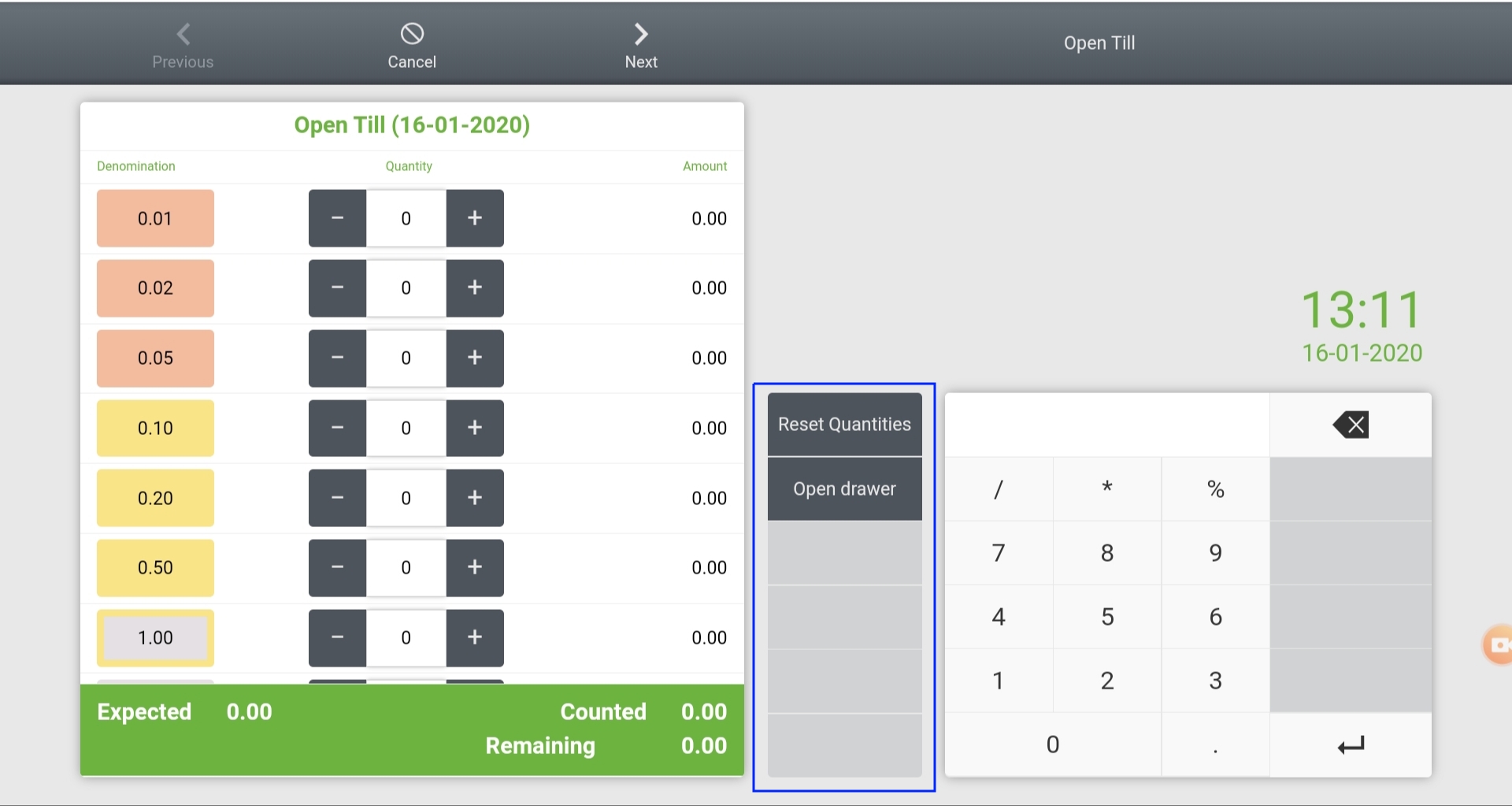 DescriptionThe left column of the virtual keypad of the sections to count denomination is inconsistent with what is shown in the rest of the steps of the cash up, as