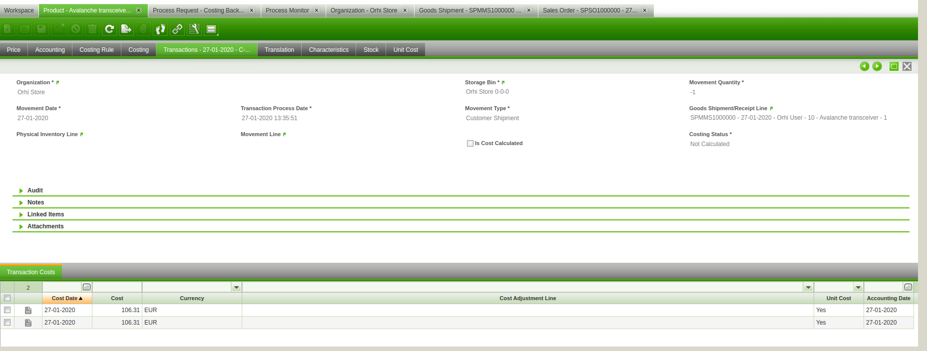 - go to the product( i used the Avalanche transceiver ) added in the sales order and check its costing hasnt been calculated yet, in the product go to the transactions tab and check the transaction costs tab, it should be empty