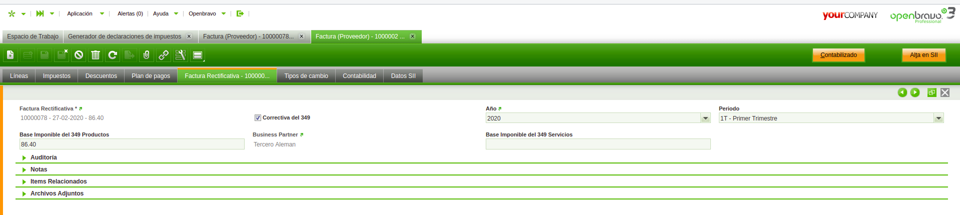 Plan de test (Español): - Ingrese como Administrador del Grupo - Crear una nueva factura de compra/venta con alguno de los siguientes impuestos: · Inversión Sujeto Pasivo UE 7% (-7%) - IVA Reducido Servicios (Compra) · Adquisiciones intracomunitarias 21% (-21%) ISP - IVA Normal ISP (Compra) · Inversión Sujeto Pasivo UE 18% (+18%) - IVA Normal Servicios (Compra) · Inversión Sujeto Pasivo UE 16% (-16%) - IVA Normal Servicios (Compra) · Adquisiciones intracomunitarias 7% (+7%) - IVA Reducido (Compra) · Inversión Sujeto Pasivo UE 10% (-10%) - IVA Reducido Servicios (Compra) · Inversión Sujeto Pasivo UE 16% (+16%) - IVA Normal Servicios (Compra) · Adquisiciones intracomunitarias 21% (+21%) ISP - IVA Normal ISP (Compra) · Adquisiciones intracomunitarias 18% (+18%) - IVA Normal (Compra) · Adquisiciones intracomunitarias 16% (+16%) - IVA Normal (Compra) · Adquisiciones intracomunitarias 8% - IVA Reducido (Compra) · Adquisiciones intracomunitarias 4% (-4%) - IVA Super Reducido (Compra) · Inversión Sujeto Pasivo UE 7% (+7%) - IVA Reducido Servicios (Compra) · Adquisiciones intracomunitarias 21% - IVA Normal (Compra) · Inversión Sujeto Pasivo UE 10% (+10%) - IVA Reducido Servicios (Compra) · Adquisiciones intracomunitarias 16% (-16%) - IVA Normal (Compra) · Adquisiciones intracomunitarias 10% (+10%) - IVA Reducido (Compra) · Adquisiciones intracomunitarias 21% (-21%) - IVA Normal (Compra) · Inversión Sujeto Pasivo UE 21% (-21%) - IVA Normal Servicios (Compra) · Adquisiciones intracomunitarias 16% - IVA Normal (Compra) · Adquisiciones intracomunitarias Bienes Inversión 21% (+21%) - IVA Normal Bienes Inversión (Compra) · Adquisiciones intracomunitarias Bienes Inversión 18% (-18%) - IVA Normal Bienes Inversión (Compra) · Adquisiciones intracomunitarias 10% (-10%) - IVA Reducido (Compra) · Inversión Sujeto Pasivo UE 8% (-8%) - IVA Reducido Servicios (Compra) · Adquisiciones intracomunitarias 18% (-18%) - IVA Normal (Compra) · Adquisiciones intracomunitarias Bienes Inversión 18% (+18%) - IVA Normal Bienes Inversión (Compra) · Adquisiciones intracomunitarias 4% (+4%) - IVA Super Reducido (Compra) · Adquisiciones intracomunitarias 8% (+8%) - IVA Reducido (Compra) · Adquisiciones intracomunitarias 4% - IVA Super Reducido (Compra) · Adquisiciones intracomunitarias 21% (+21%) - IVA Normal (Compra) · Adquisiciones intracomunitarias 18% - IVA Normal (Compra) · Inversión Sujeto Pasivo UE 8% (+8%) - IVA Reducido Servicios (Compra) · Inversión Sujeto Pasivo UE 21% (+21%) - IVA Normal Servicios (Compra) · Adquisiciones intracomunitarias 8% (-8%) - IVA Reducido (Compra) · Adquisiciones intracomunitarias exentas - Exento (Compra) · Adquisiciones intracomunitarias 7% - IVA Reducido (Compra) · Inversión Sujeto Pasivo UE 18% (-18%) - IVA Normal Servicios (Compra) · Adquisiciones intracomunitarias 10% - IVA Reducido (Compra) · Adquisiciones intracomunitarias 7% (-7%) - IVA Reducido (Compra) · Adquisiciones intracomunitarias Bienes Inversión 21% (-21%) - IVA Normal Bienes Inversión (Compra) · Servicios prestados UE (%N=>0%) - IVA Normal Servicios (Venta) · Servicios prestados UE (%R=>0%) - IVA Reducido Servicios (Venta) · Entregas intracomunitarias Bienes Inversión (%N=>0%) - IVA Normal Bienes Inversión (Venta) · Entregas intracomunitarias (%R=>0%) - IVA Reducido (Venta) · Entregas intracomunitarias (%N=>0%) ISP - IVA Normal ISP (Venta) · Entregas intracomunitarias (%SR=>0%) - IVA Super Reducido (Venta) · Entregas intracomunitarias (%N=>0%) - IVA Normal (Venta) - Rellenar el resto de datos, completar y contabilizar. - Anular esta factura e ir a su correspondiente anulada, solapa "Factura Rectificativa", rellenar los campos según corresponda y contabilizar la factura. - Correr el modelo 349 y verificar que los datos son correctos. |