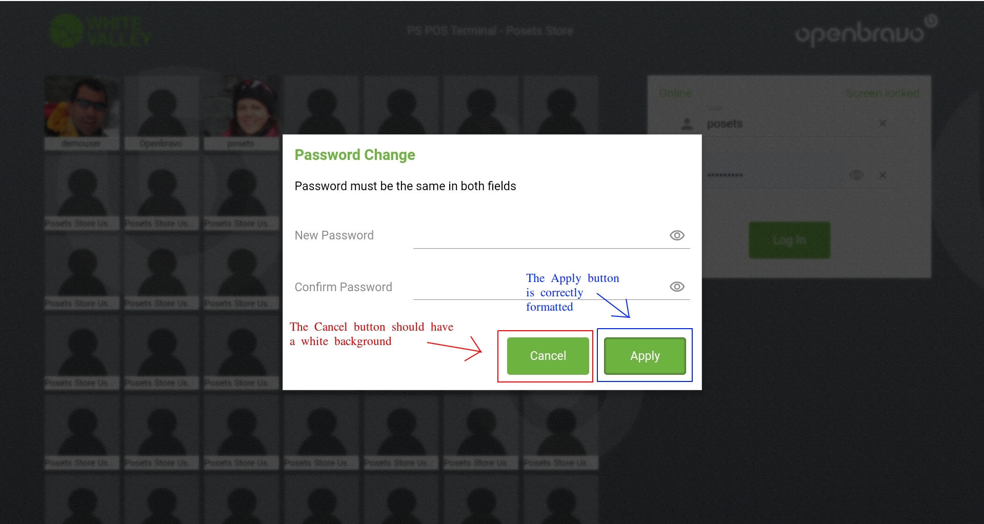 | Description | The "Password Change" popup shown upon password expiry when attempting to login doesn't have a properly defined default action button, in accordance to what are considered the style rules for the skinnable POS. The "Apply" button should be the only one to have the green background since it's the default action when performing the password change, whilst the "Cancel" button should have a white background. This issue has been reported as a result of this item of the Description of the related issue still having to be addressed: - The order and style of the "Apply" and "Cancel" buttons could potentially be out of place and not in accordance to the style of the buttons for the skinnable POS | |||||||