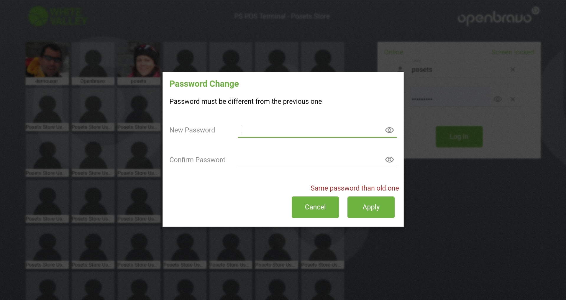 | Steps To Reproduce | -- In the Backend 0. Log in the ERP as "Openbravo" user with the "The White Valley Group Admin" role 1. Go to the User window 2. Select the "vallblanca" user, check the "Expired Password" checkbox, and save the record -- In the Frontend 0. Try to log in with the "vallblanca" user. The "Password Change" popup will appear 1. Input the same password in the two input fields NOTICE that an error message appears, duplicating what the description already says | |||||||