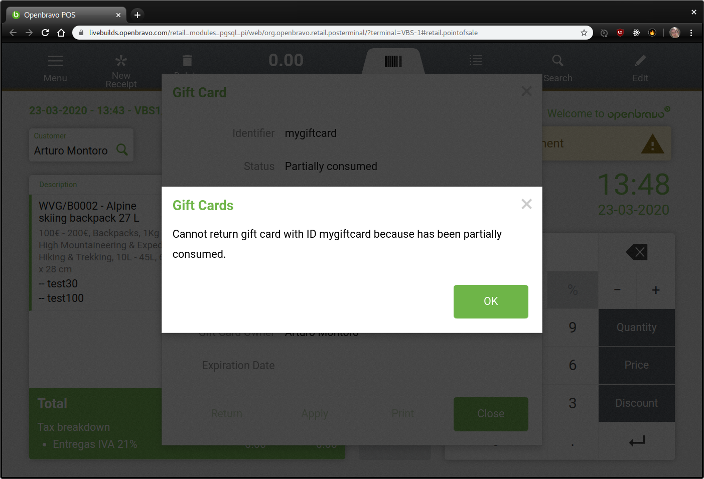 | Steps To Reproduce | In the backoffice: Set the Do not allow Sales with return preference to Y In the POS: Add a Gift Card Infinite to the receipt Pay it In the backoffice: Check a new Gift Card Instance has been created in New status In the POS: Add a product to the receipt Select Gift / Credit Notes Select previously created Gift Card Return it Check the following error is shown and the gift card is not included You cannot add a negative line in a sales order Complete the ticket In the backoffice: Check the Gift Card Instance is Closed and it is set as Cancelled | |||||||