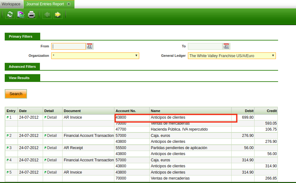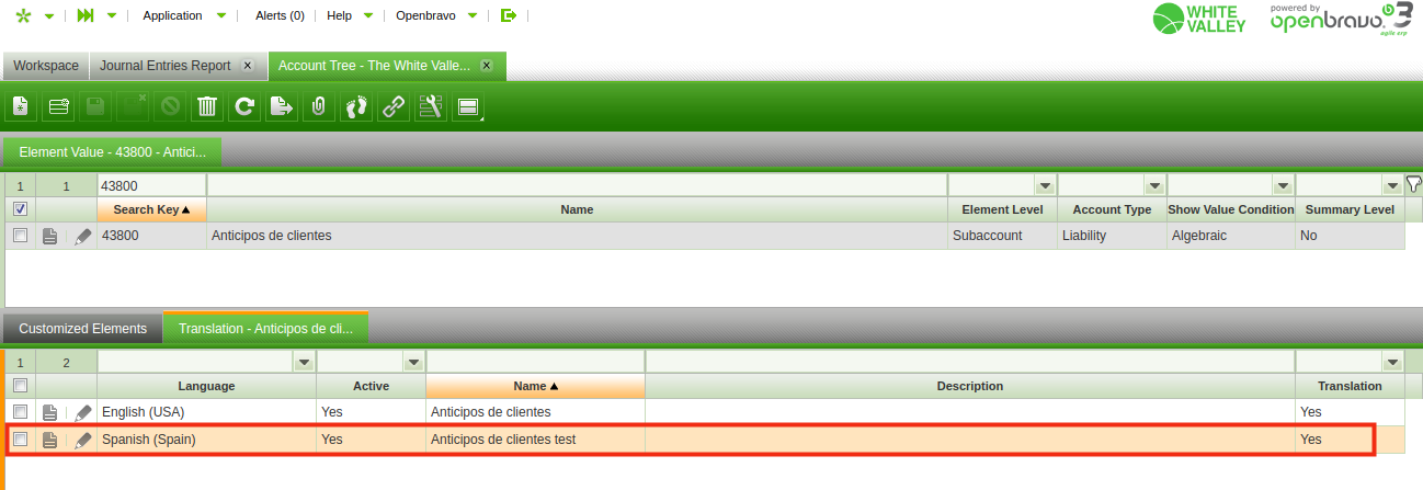 --Test Plan Mantis-- As the System Administrator role: - Go to the Language window. Open the "Spanish (Spain)" record and enable the System Language checkbox. Save the record. Log out and Log in. As the F&B International Group Admin role and Spanish as Profile's language: - Go to the Account Tree window. Select the "F&B International Group Account Account" record. - Go to the Element Value Tab and search for the "Inventory Asset" record and select it. - Go to the Translation Subtab and open the Spanish(Spain) record. Put any desired name and enable the Translation checkbox. Save the record. - Go to the Journal Entries Report window. Select "F&B España, S.A" as Organization and "F&B International Group US/A/US Dollar" as General Ledger. Press the Search button. #In this moment the previously translation appears instead of Inventory Asset# |
