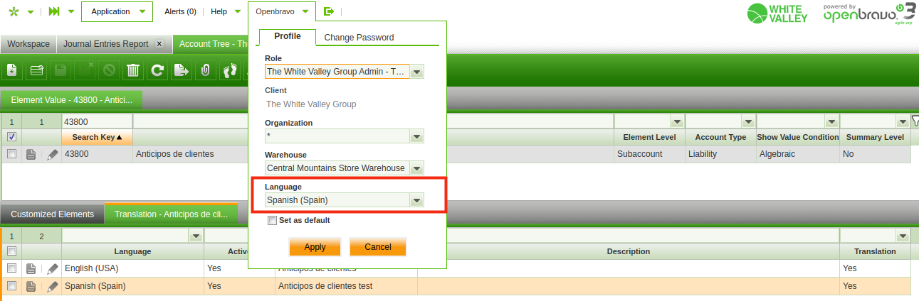 | Steps To Reproduce | 1.- Go to Account Tree Window and select any account. 2.- Select any element in the Element value tab. 3.- Create a record in "Translation" Tab for any language (e.i. Spanish) and check the traslation checkbox. (See image 1) 4.- Change the profile languaje to Spanish (See image 2) 5.- Execute the Journal entries report (See image 3) | |||||||||||
