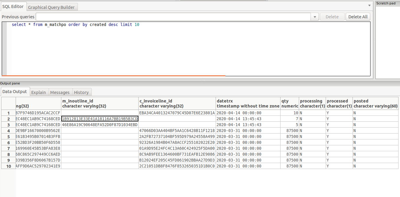 | Steps To Reproduce | 1) Check how those variables are gotten COALESCE((SELECT SUM(CASE WHEN M_MATCHPO.M_INOUTLINE_ID IS NULL THEN M_MATCHPO.QTY ELSE 0 END) FROM M_MATCHPO WHERE M_MATCHPO.C_ORDERLINE_ID=C_ORDERLINE.C_ORDERLINE_ID), 0) AS QtyDelivered, COALESCE((SELECT SUM(CASE WHEN M_MATCHPO.C_INVOICELINE_ID IS NULL THEN M_MATCHPO.QTY ELSE 0 END) FROM M_MATCHPO WHERE M_MATCHPO.C_ORDERLINE_ID=C_ORDERLINE.C_ORDERLINE_ID), 0) AS QtyInvoiced 2) Check how those variables are used to calculate the higher amount of both later ->A: v_QtyOrdered := COALESCE(CASE WHEN (Cur_Inventory.QtyDelivered < 0) THEN LEAST(Cur_Inventory.QtyDelivered, Cur_Inventory.QtyInvoiced) ELSE CASE WHEN (Cur_Inventory.QtyDelivered = 0) THEN Cur_Inventory.QtyInvoiced ELSE GREATEST(Cur_Inventory.QtyDelivered, Cur_Inventory.QtyInvoiced) END END, 0); ->B: ELSE (COALESCE(c_uom_convert((CASE WHEN (Cur_Inventory.QtyDelivered < 0) THEN LEAST(Cur_Inventory.QtyDelivered, Cur_Inventory.QtyInvoiced) ELSE GREATEST(Cur_Inventory.QtyDelivered, Cur_Inventory.QtyInvoiced) END) 3) One can also check it functionally, create a purchase order, with two lines (example one qty=10 and other qty=5), create a goods receipt for one line and a purchase invoice for the other, then run the query on database of step 1 for the c_orderline_id (see attached images for a similar example) | |||||||||||
