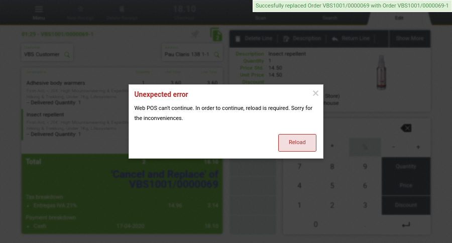 | Steps To Reproduce | (1) errors in the browser log: [2020-04-17T01:29:58+0000] [SEVERE] web/js/gen/53a2f6b3fbc1d0b997a68bf119bfc6c6.js 212:14 "[checkBlocked][transaction]The order does not exists or is frozen. Wrong write in c_order avoided [undefined][VBS1001/0000069-1] - Caller: G.d.save (web/js/gen/53a2f6b3fbc1d0b997a68bf119bfc6c6.js:51169:18) - callerInfo: \nObject.OB.Dal.save (web/js/gen/53a2f6b3fbc1d0b997a68bf119bfc6c6.js:8088:22);\nG.d.save (web/js/gen/53a2f6b3fbc1d0b997a68bf119bfc6c6.js:51169:18);\nsaveAndTriggerEvents (web/js/gen/53a2f6b3fbc1d0b997a68bf119bfc6c6.js:51443:14);\nweb/js/gen/53a2f6b3fbc1d0b997a68bf119bfc6c6.js:51511:9;\nG.d.modelOfAnOrder.calculateTaxes (web/js/gen/53a2f6b3fbc1d0b997a68bf119bfc6c6.js:77114:7); line: web/js/gen/53a2f6b3fbc1d0b997a68bf119bfc6c6.js:8470:26 (*)" | |||||||||||