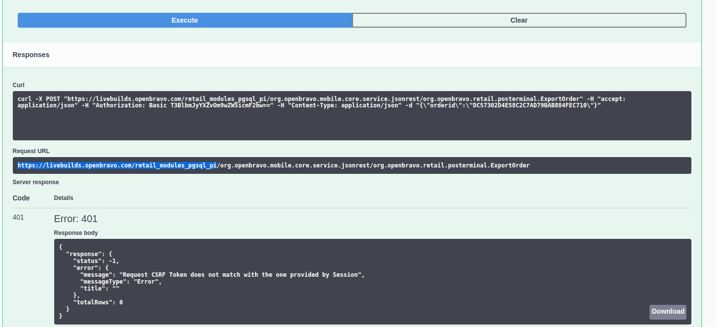 | Description | The export order works the first time ( reatil API ) and then will show this error message : { "response": { "status": -1, "error": { "message": "Request CSRF Token does not match with the one provided by Session", "messageType": "Error", "title": "" }, "totalRows": 0 } } It is the same with postman by example. | |||||||