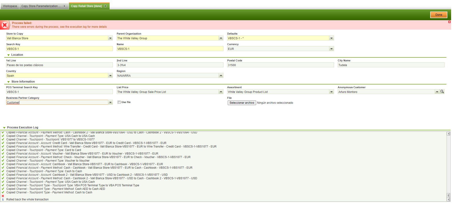 | Steps To Reproduce | 0-With Copy Retail Store module installed, log in to backoffice and go to Copy Retail Store Parametrization window. 1-Create a new record with the values of the attached image. 2-Go to Copy Retail Store and fill the input fields with the values of the attached image. 3-Click Done to start the Copy Retail Store process. DEFECT: The process will fail but NO ERROR MESSAGE WILL BE SHOWN. | |||||||