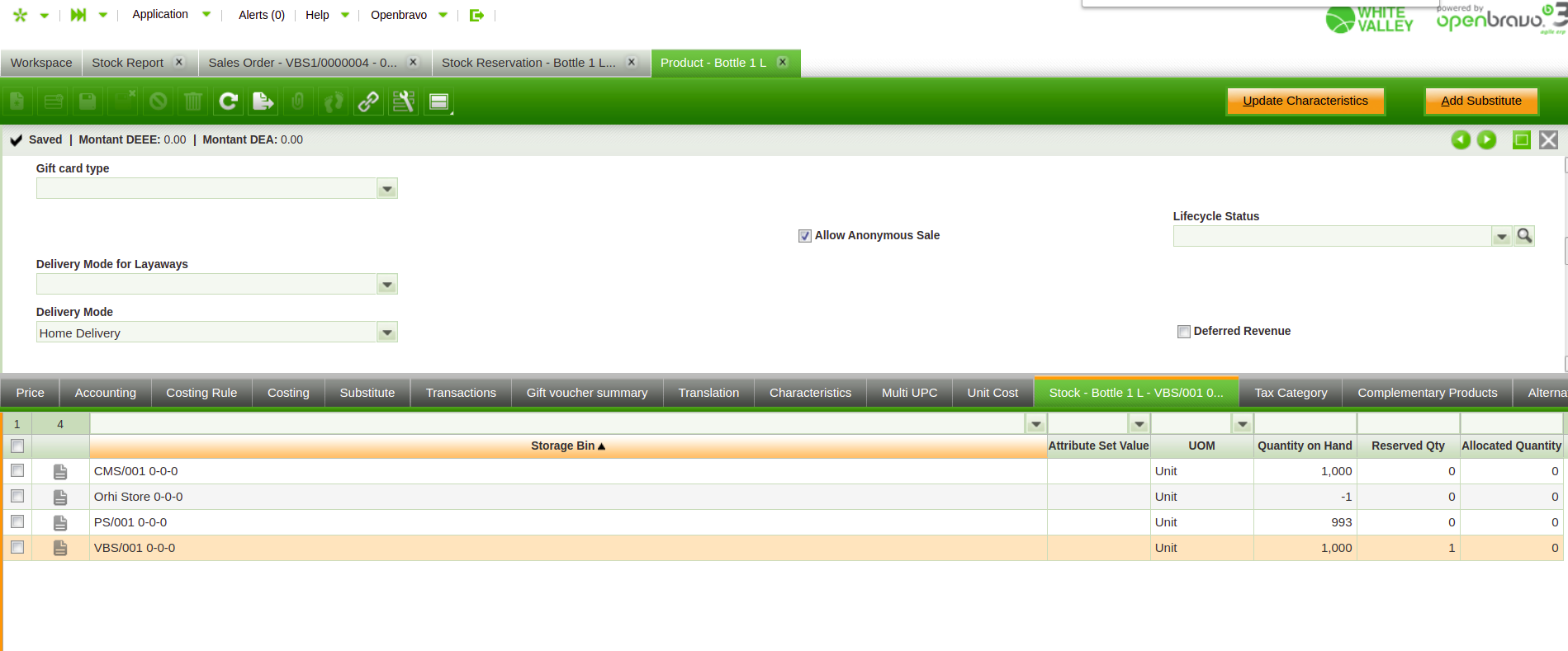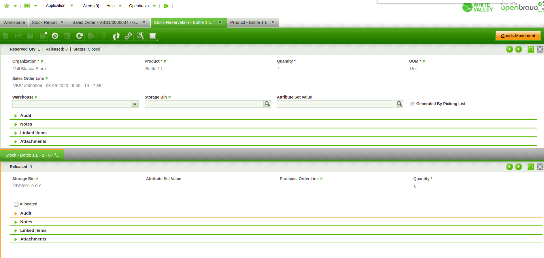 | Steps To Reproduce | * Access to Livebuilds with modules instance, role White Valley Group * Window Preference. Check that preference “Enable stock reservations” is enabled and also enable “Web pos enable delivery modes” * Window Product, select Bottle 1 L. Select Home Delivery on field Delivery Mode. * Go to Web POS and create a ticket for 1 of it, pay for it. * On Sales Order window, select it. Select its line, click on button Manage Reservation, select the line and click on done. * On window Stock Reservation the reservation has been created, status Completed. * On Web POS select the order from the Menu (Open Receipt). Cancel the order (Menu > Cancel this order) and pay for it (give money back). * On window Stock Reservation remove filters to see previous reservation. Status is closed but qty and reserved qty are 1 * Go to Product window. Tab Stock, reserved qty is still 1 here | |||||||