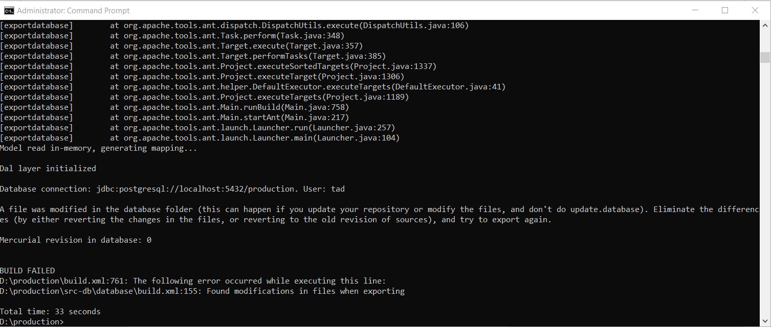 D:\production\src-db\database\build.xml:155: Found modifications in files when exporting