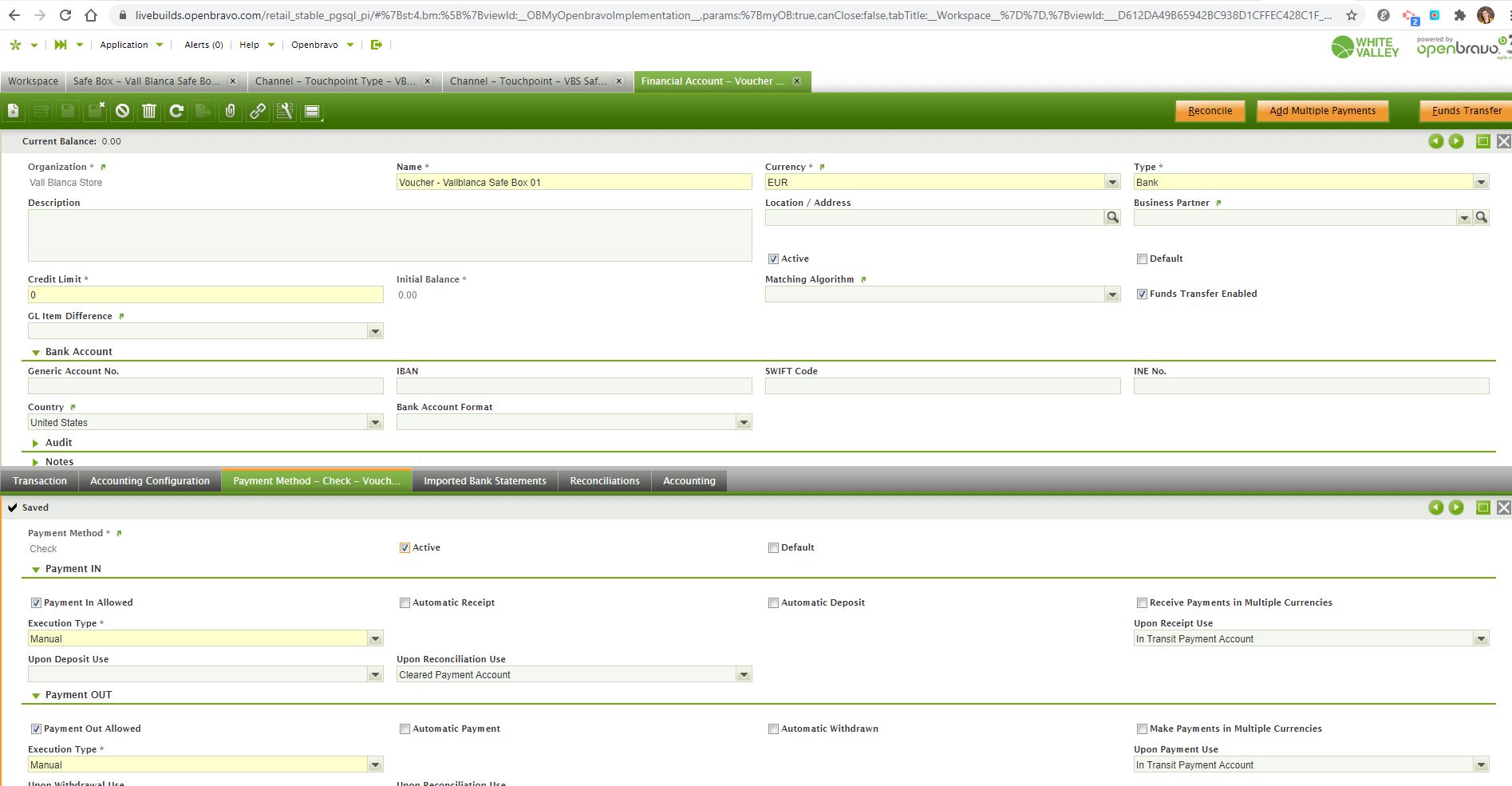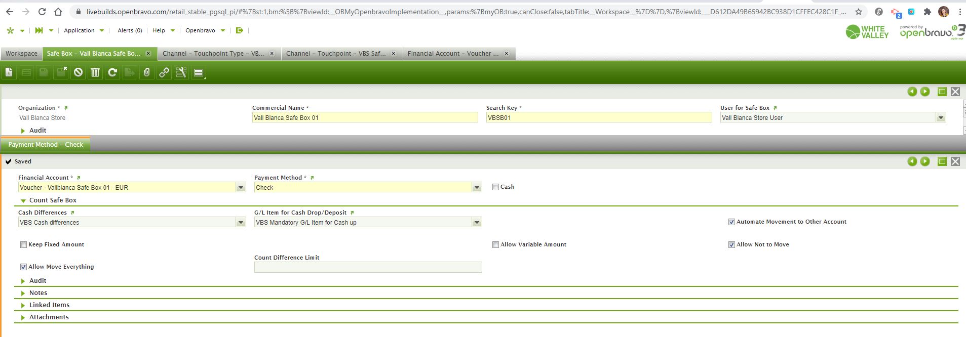 | Steps To Reproduce | 1. Log into https://livebuilds.openbravo.com/retail_stable_pgsql_pi [^] 2. Create a new Financial Account as it is shown in the SafeBoxImage1. 3. Open the window 'Channel - Touchpoint Type' and search the 'VBS POS Safe Box Terminal Type'. 4. Set the Payment Method 'Voucher' as 'Defined in Safebox' 5. Open the window 'Safe Box' and for the 'Vall Blanca Safe Box 01' add the payment method 'Check' with the financial account created in step 2. See SafeBoxImage2. 6. Log into the terminal https://livebuilds.openbravo.com/retail_stable_pgsql_pi/web/org.openbravo.retail.posterminal/?terminal=VBSSB1#retail.pointofsale [^] with the user vallblanca. 7. In the pop up 'Safe Box Information' select VBSB01 and click in 'Check Safe Box'. 8. Do one sale and pay it with Voucher. 9. Do 'Remove Safe Box'.10. In the backend, in 'Errors While Importing POS Data', check that the error 'org.openbravo.base.exception.OBException: @APRM_INVALID_TRANSACTION@' has been generated. To fix this error, it is needed to configure the fields 'Channel Touchpoint Type || Payment Method || G/L Item for Deposits and G/L Item for Withdrawals' for the payment methods defined as'Defined in Safebox'. | |||||||