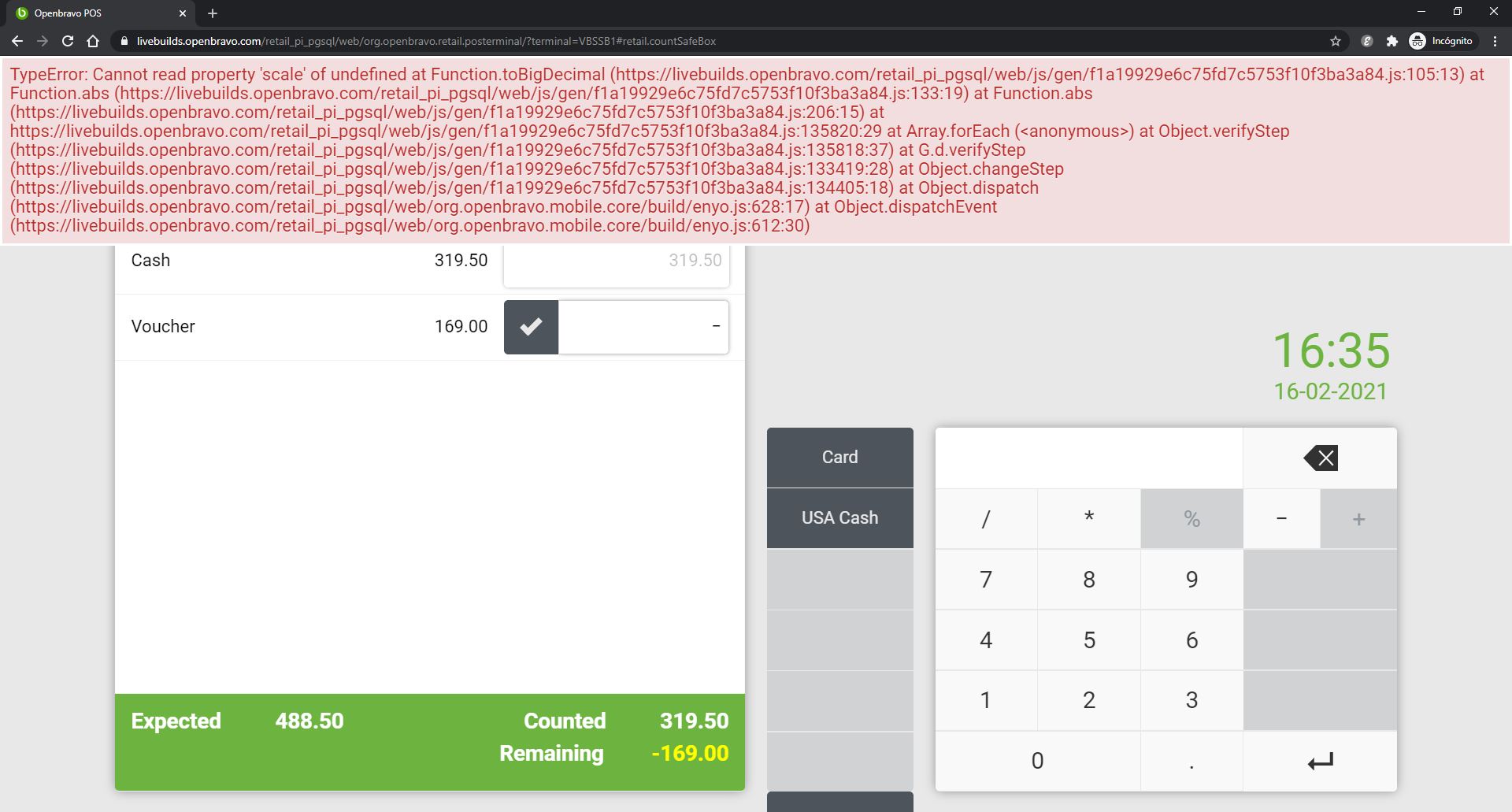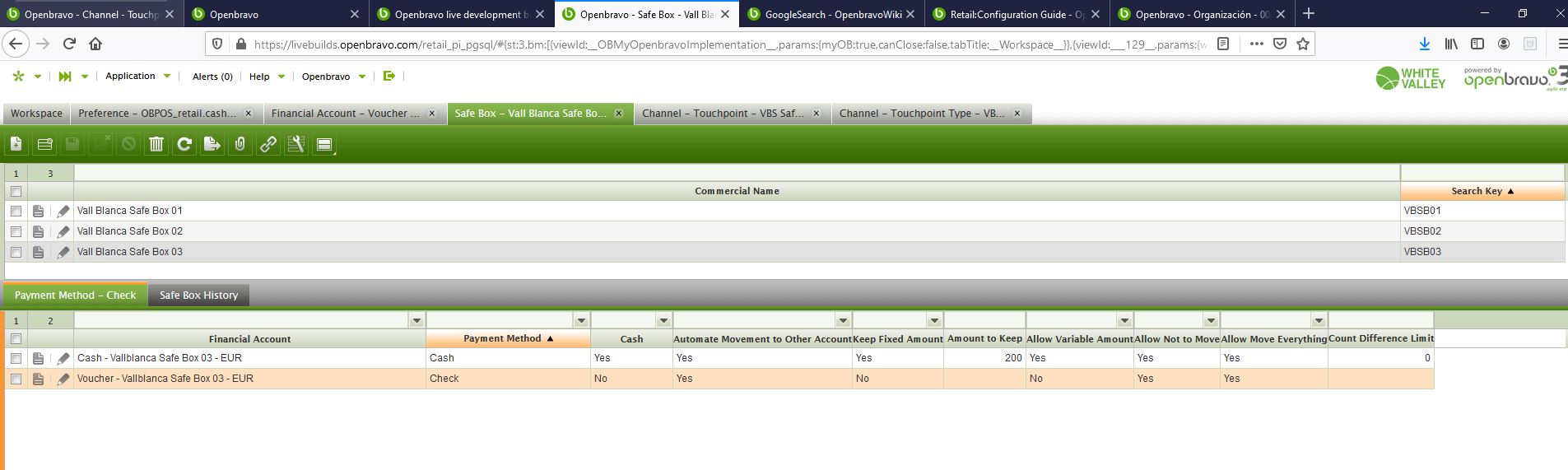| Steps To Reproduce | Configuration: 1. Log into https://livebuilds.openbravo.com/retail_pi_pgsql [^] 2. Create a new Financial Account as image2. 3. Define a new payment method for the safe box VBSB03 as image3 4. In the 'Channel - Touchpoint Type'=VBS POS Safe Box Terminal Type, define the payment method 'Voucher' as 'Defined in Safe Box'=Yes. 5. Set the preference 'CashUp - Group payments by expected amount' = Yes See in the following video how to reproduce the error: https://drive.google.com/file/d/1Fv2cpg1S-EezndTgpoC_dKmfvd4-PuqQ/view [^] | |||||||