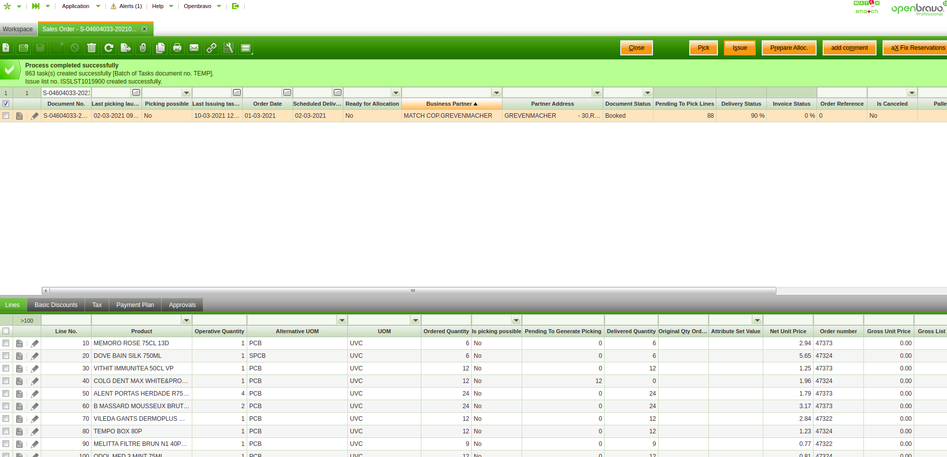 It is just creating them. Having a sales order with >900 lines ready to be issued, you click on issue button, then click on ok, then a process is launched with grey screen on that popup which after that disappears and shows the batch of tasks created successfully (here attached the image after that). I have attached here the log that they have provided. As the problem doesn't happen always we haven't been able to reproduce it then to extract more log or information. It happens punctually they say, on my test it took 1 minute, but they say that sometimes it stays forever with that grey screen as commented on the issue. |