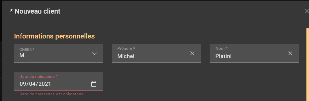 | Steps To Reproduce | Connect to the POS Create a new client Fill the required fields Fil Birthdate with today's Date Validate: the red message appears: fields is required. It is flase: invalid value for the field birthdate | |||||||