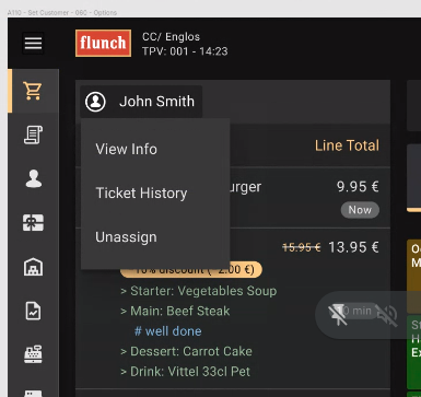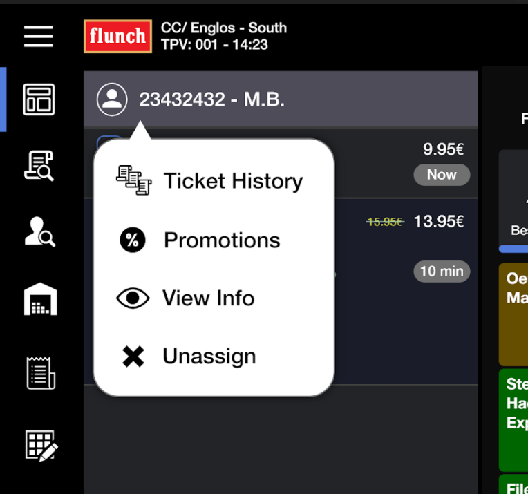 In Figma has been just added in "A110 - Set Customer - 060 - Options" This is shown only if the Customer has been already set to the receipt header (if not, it should continue showing the search customer popup). View Info should open the readonly popup with the form of all the information about the customer. In the bottom, there should be "EDIT" and "UNASSIGN FROM RECEIPT" and "CLOSE" buttons. Ticket History by the moment can be as simple as go to "Orders" window with the Customer filter set to this particular customer. Unassign should remove the Customer from the receipt header. Additionally, custom developments should be able to add more entries there, like the "Promotions" one that jmelin pointed |