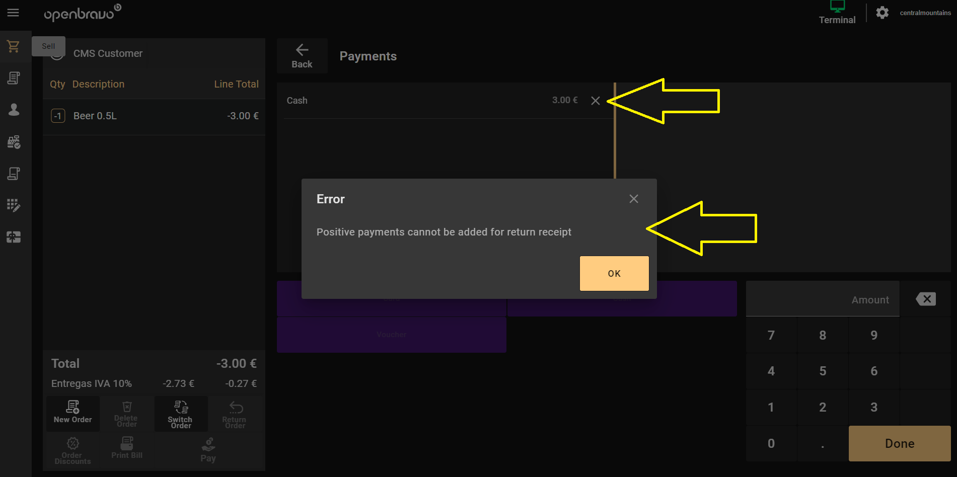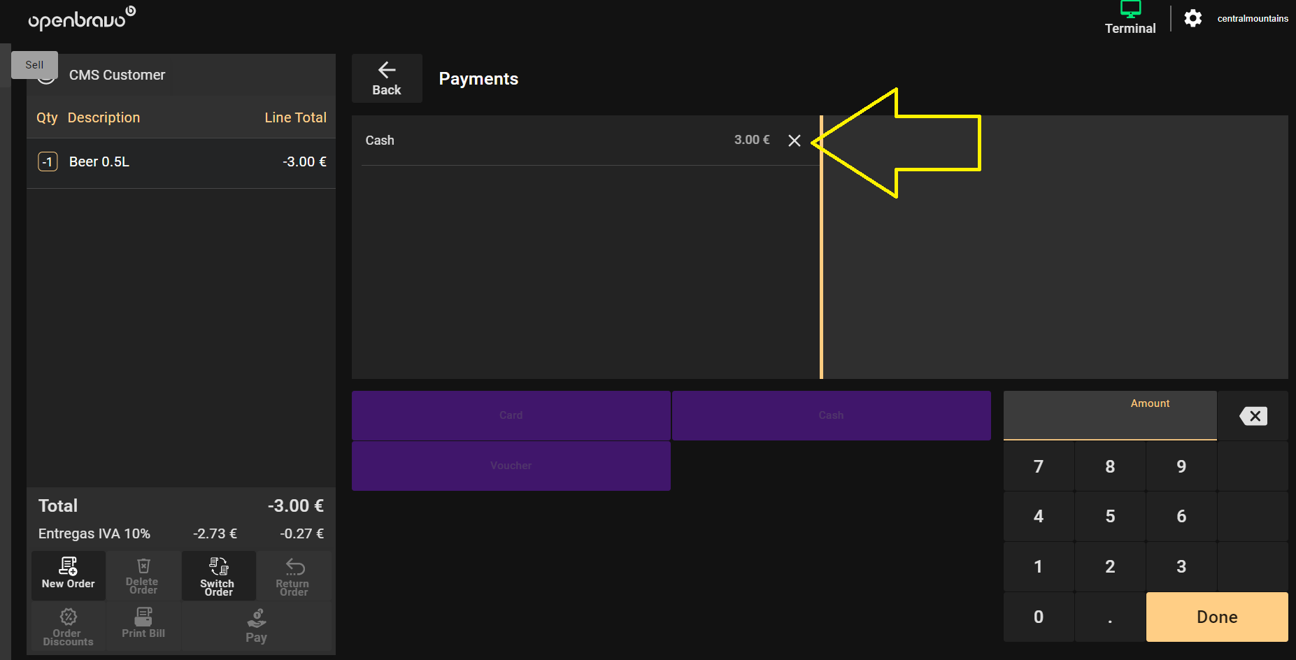 6-Now, click X to remove the 3€ payment and click Cash button again. A 3€ payment that looks identical to the previos one is added. Now click Done. It is possible to close the receipt now.