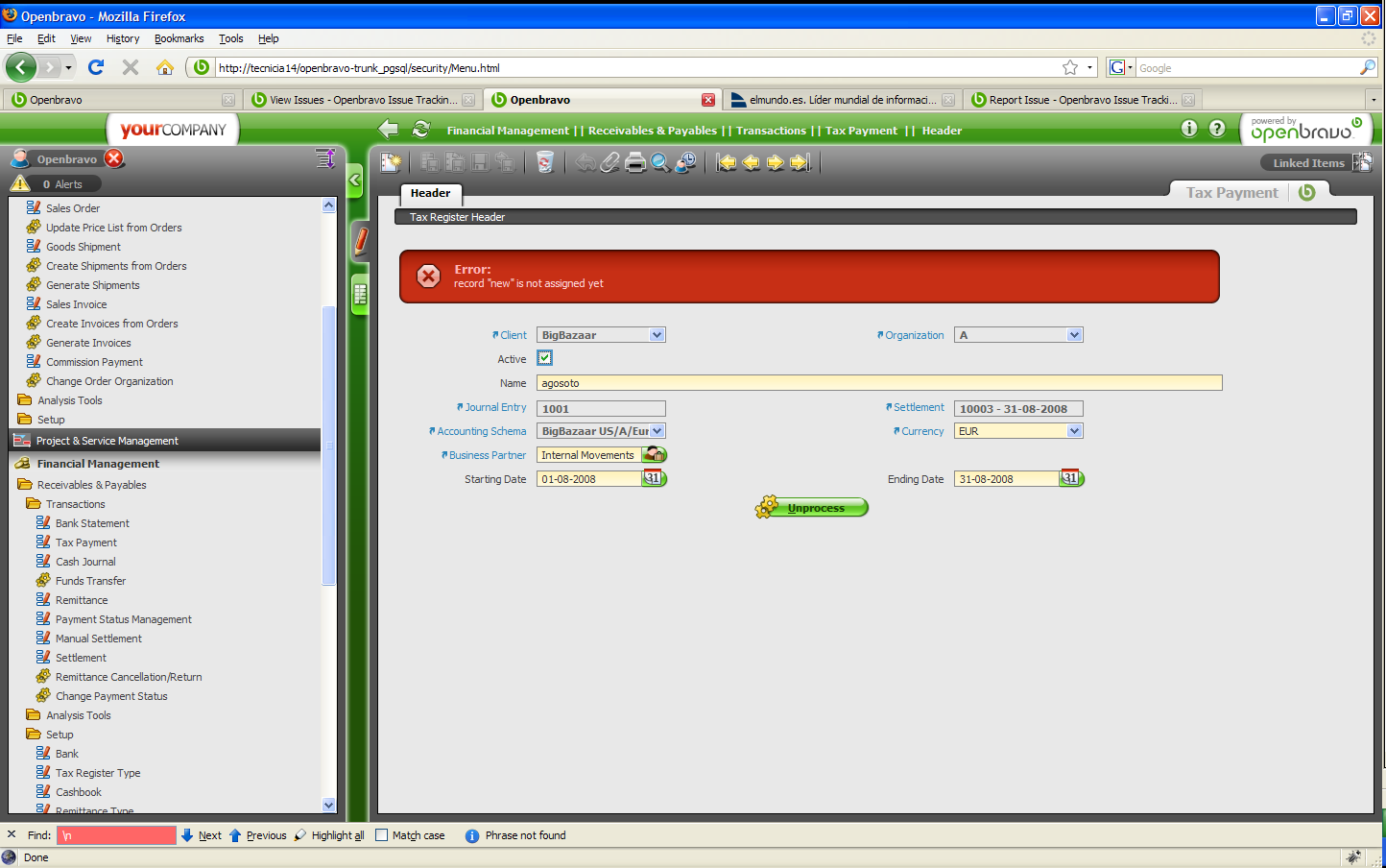 | defect | [Openbravo ERP] 09. Financial management | major | always | 2008-08-20 11:37 | 2008-09-04 09:36 | |||
