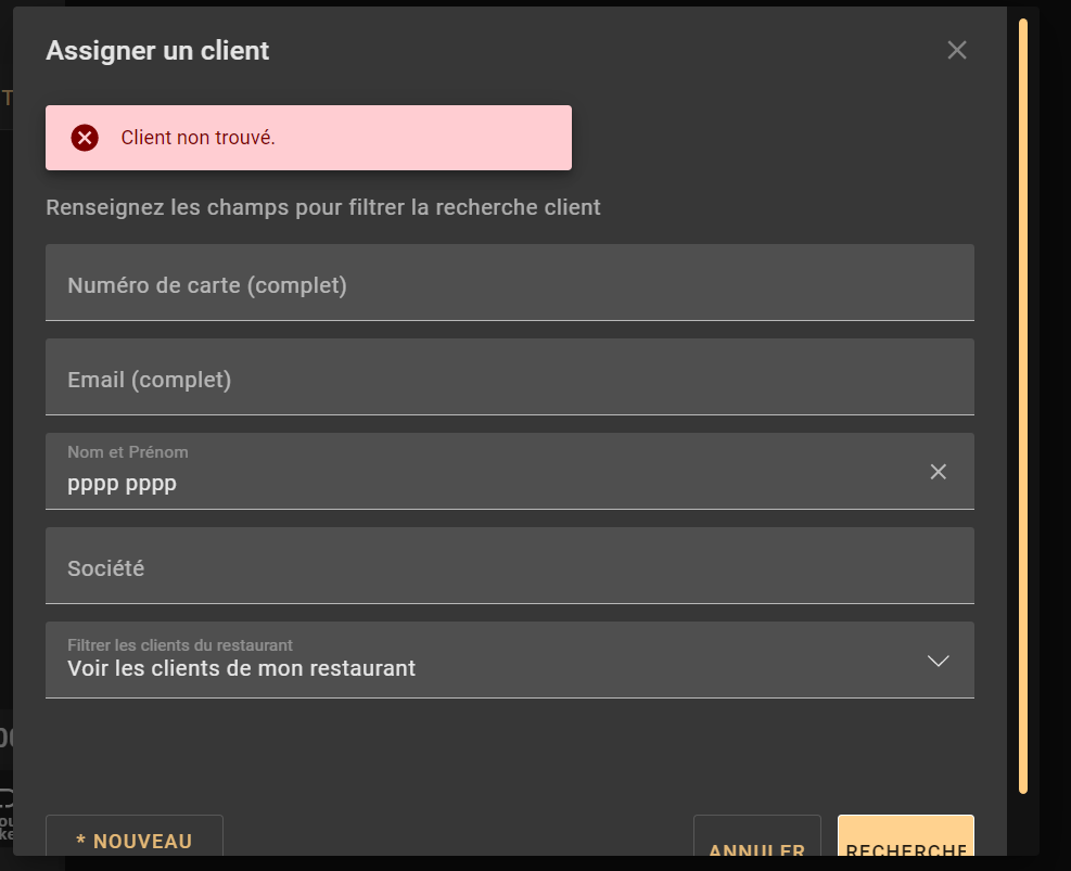 DescriptionAfter making a search that do not find ans assign a customer, the message 'Customer not found' is displayed in the search window