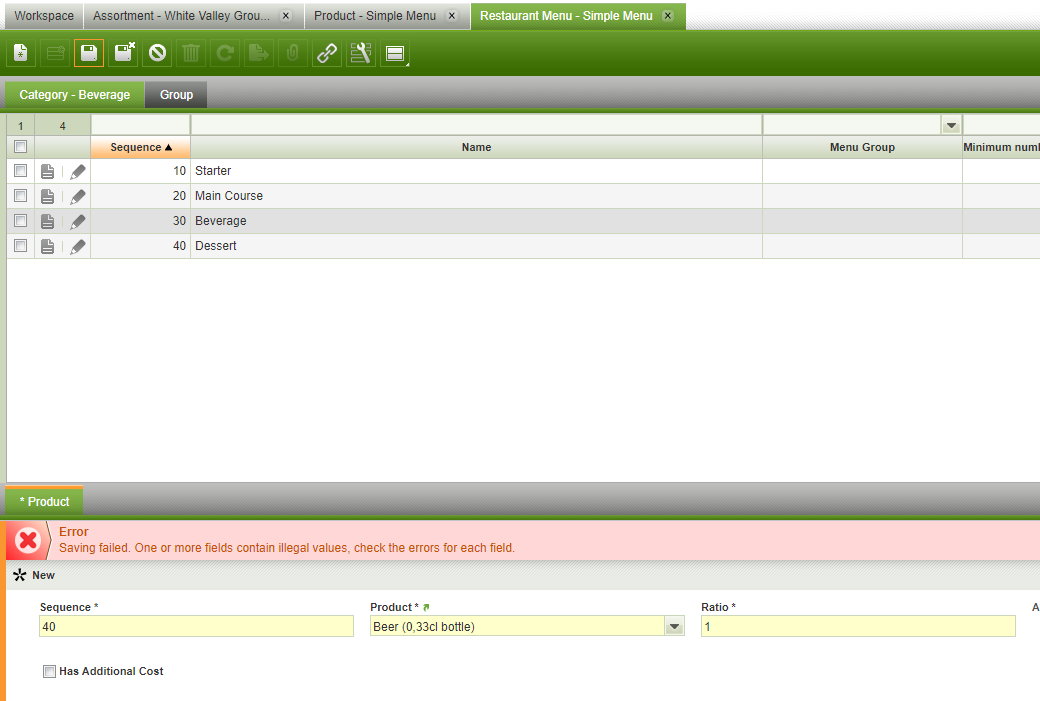 | Steps To Reproduce | 1. Go to Restaurant Menu window 2. Select "simple menu" 3. Select a category 4. Go to Product subtab and click "New record in form" 5. Complete all the mandatory fields and check the error message shown as shown in the attached screenshot. 6. Repeat the process using "Grid mode" and check the record is properly added. | |||||||
