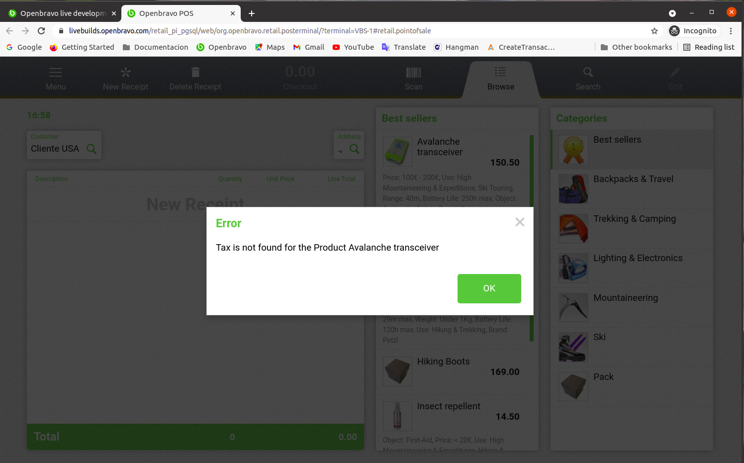 | Steps To Reproduce | Go to https://livebuilds.openbravo.com/retail_pi_pgsql/ [^] Enable the preference "Web POS Enable Delivery Modes". Go to Product window and select HOME DELIVERY Delivery Mode for the product Avalanche Transceiver. Go to Business Partner window and create two customers in "The White Valley Group" organization, one located in France and the other one located in the United States. Go to POS create a new order for the customer of France. Select the product Avalanche Transceiver. Verify that the tax rate "Entregas intracomunitarias (%N=>0%)" is selected. Complete the sale. This is correct. Create a new order for the USA Customer, select Avalanche transceiver product. Verify that below error is shown: Tax is not found for the Product Avalanche transceiver | |||||||