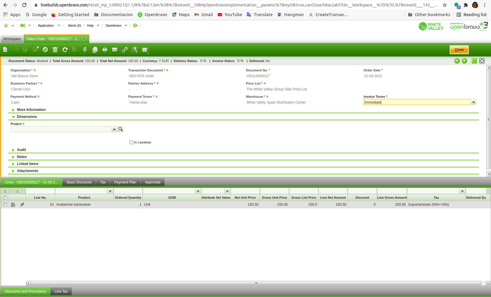 Test Plan Backoffice configuration: - Enable the preference "Web POS Enable Delivery Modes". - Go to product window and configure "Avalanche Transceiver" as "Home Delivery". - Go to business partner window and create a customer do NOT exempt, located in France. Create another one do NOT exempt, located in the USA. - Go to Busines partner window and create a new customer Exempt, and located in Spain (do not add any Region). - Go to Product window and set "Exento" tax category to the product Headlamp Ultralight. - Go to Tax Rate window and verify that below listed tax rates are configured as tax exempt: Ventas Exentas, Ventas exentas (%N=>0%),Entregas intracomunitarias (%N=>0%) y Exportaciones (%N=>0%). Test 1 Go to Web POS. Create a new sale for the French Customer. Select the product Avalanche Transceiver. Verify that the tax rate "Entregas intracomunitarias (%N=>0%)" is shown. This is correct as Delivery Mode is Home Delivery. Select Balaclava Cap. Verify that the tax rate shown is "Entregas IVA 21%". This is correct as Delivery Mode is Pick&Carry. Select Headlamp Ultralight. Verify that the tax rate shown is "Ventas Exentas" as this product is related to an exempt tax category. Test 2 Create a new sale for the USA Customer. Select the product Avalanche Transceiver. Verify that the tax rate "Exportaciones %N=>0%)" is shown. This is correct as Delivery Mode is Home Delivery. Select Balaclava Cap. Verify that the tax rate shown is "Entregas IVA 21%". This is correct as Delivery Mode is Pick&Carry. Select Headlamp Ultralight. Verify that the tax rate shown is "Ventas Exentas" as this product is related to an exempt tax category. Test 3 Create a new sale for the Anonymous customer (NOT exempt) Select the product Avalanche Transceiver. Verify that the tax rate "Entregas IVA 21%)" is shown. This is correct as Delivery Mode is Home Delivery, and its address is Spain. Select Balaclava Cap. Verify that the tax rate shown is "Entregas IVA 21%". This is correct as Delivery Mode is Pick&Carry. Select Headlamp Ultralight. Verify that the tax rate shown is "Ventas Exentas" as this product is related to an exempt tax category. Test 4 Create a new sale for the exempt customer (Exempt) Select the product Avalanche Transceiver. Verify that the tax rate "Ventas exentas (%N=>0%)" is shown. This is correct as the product belongs to Normal VAT, but the customer is exempt, and located in Spain. Select Balaclava Cap. Verify that the tax rate shown is "Ventas exentas (%N=>0%)". This is correct as the product belongs to Normal VAT, but the customer is exempt, and located in Spain. Select Headlamp Ultralight. Verify that the tax rate shown is "Ventas Exentas" as this product is related to an exempt tax category. |