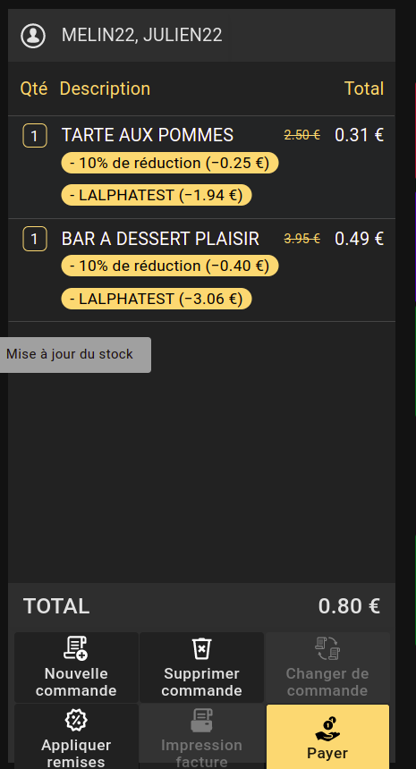 | Steps To Reproduce | Pre-requisite: It's not reproductible in tap because we need promotion type " Variable Discount per Total Amount" In customer terminal: 1) Search for the client with card number 1401000009113. A popup will be shown, press OK. 2) add a couple of products (it doesn't matter the product) -- See that the picture1 is reproduced 3) Log out of the POS 4) Go to the backoffice and change the configuration of the organization of the till used (in the till from above, englos) checking the "Show order discounts in a separate section" 5) Log in the same till (the previous order will be loaded) -- See that the picture2 is reproduced. | |||||||