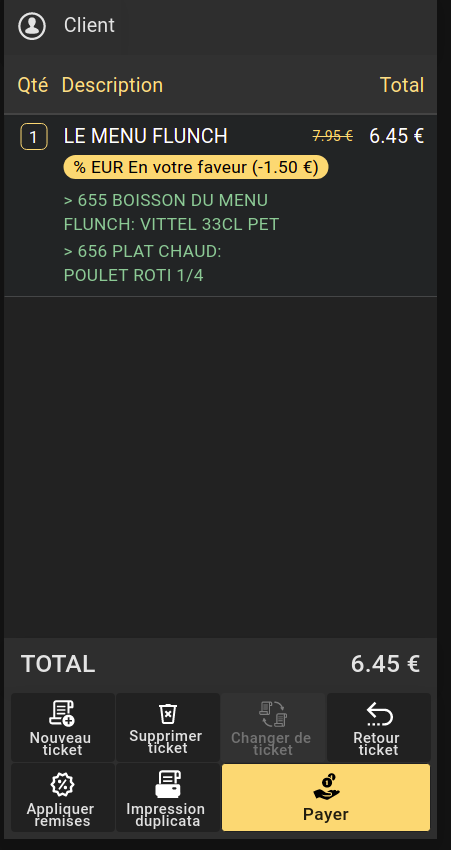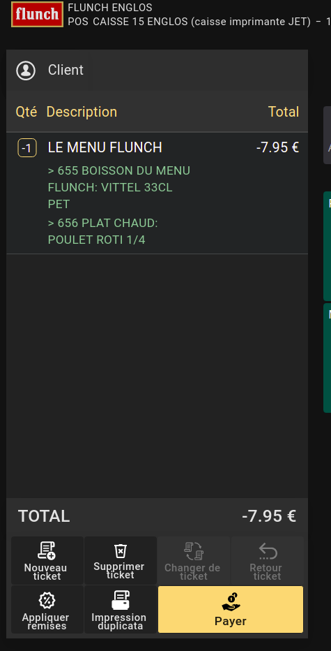 | Steps To Reproduce | Configure the backoffice properly: - Configure the Menu customer favor discount in the organization window - Set a price for a menu bigger than the sum of the price of its components Log in the POS - Select the menu with the big price - Select its components See that the menu customer favor discount is applied - Press return ticket The menu customer favor discount disappears and the amount to return is bigger. | |||||||