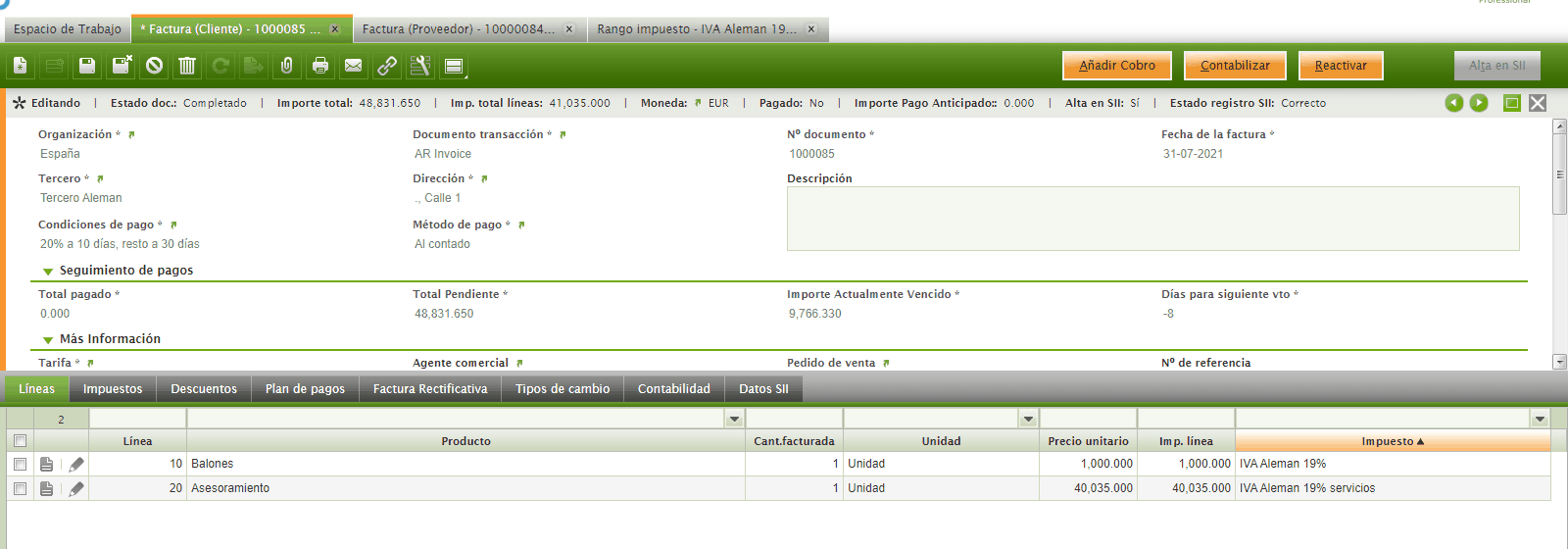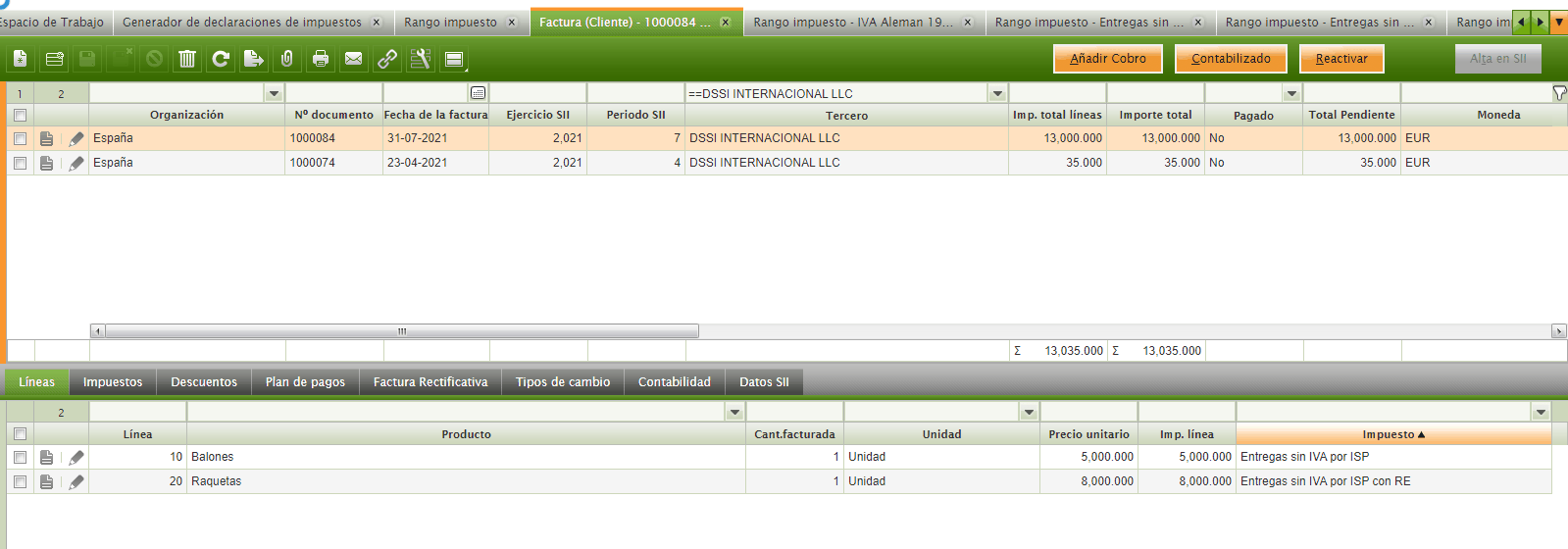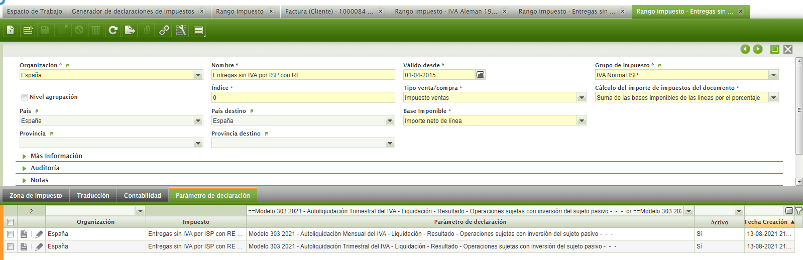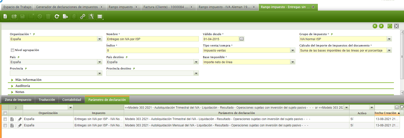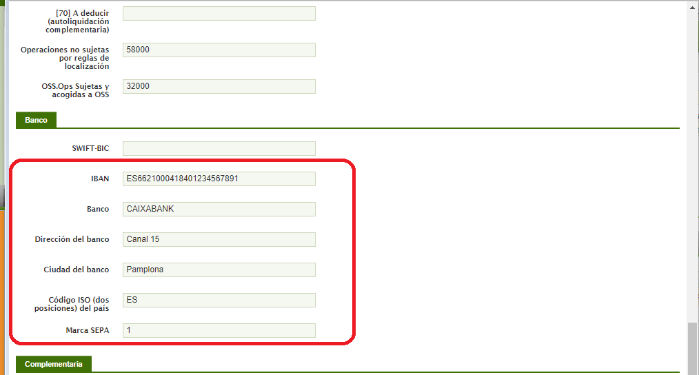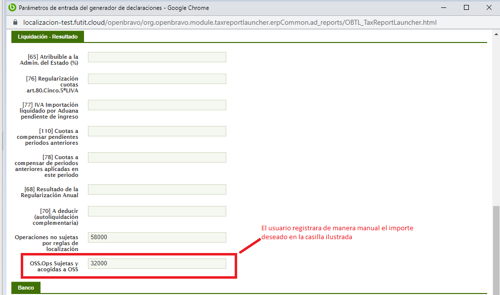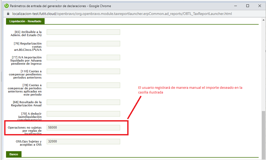 Casilla 120. Se ha creado un campo nuevo como parámetro de entrada en el pop-up llamado "Operaciones no sujetas por reglas de localización" Ver adjuntos Casilla 122. Se ha creado un nuevo parámetro dentro de la declaración de IVA mensual y trimestral 2021 llamado "Liquidación resultado - Operaciones sujetas con inversión del sujeto pasivo". El usuario deberá eliminar de los rangos de impuestos "Entregas sin IVA por ISP" y "Entregas sin IVA por ISP con RE" el parámetro Liquidación resultado - Operaciones no sujetas o con con Inversión del Sujeto Pasivo y añadirle el nuevo. Como se ve en la imagen hemos realizado la prueba con un rango de impuesto y hemos creado dos facturas y el resultado se refleja en la declaración en esta casilla. Ver adjuntos Se ha creado una factura con ambos impuestos y en la declaración se refleja el output de la misma. Ver adjunto. Casilla 123. Se ha creado un nuevo parámetro dentro de la declaración de IVA mensual y trimestral 2021 llamado "Liquidación resultado - OSS. Operaciones no sujetas por Reglas de Localización acogidas a la OSS (Ventanilla Única)" El usuario deberá asignar este parametro a los impuestos de IVA Extrajero (dentro de la UE) correspondiente Casilla 124. Se ha creado un campo nuevo como parámetro de entrada en el pop-up llamado " OSS. Operaciones sujetas y acogidas a la OSS" Ver adjuntos Seccion Banco. Ya se han añadido los nuevos campos en el pop-Up de Parametros de entrada dentro del Generador de declaraciones. Ver imagen |