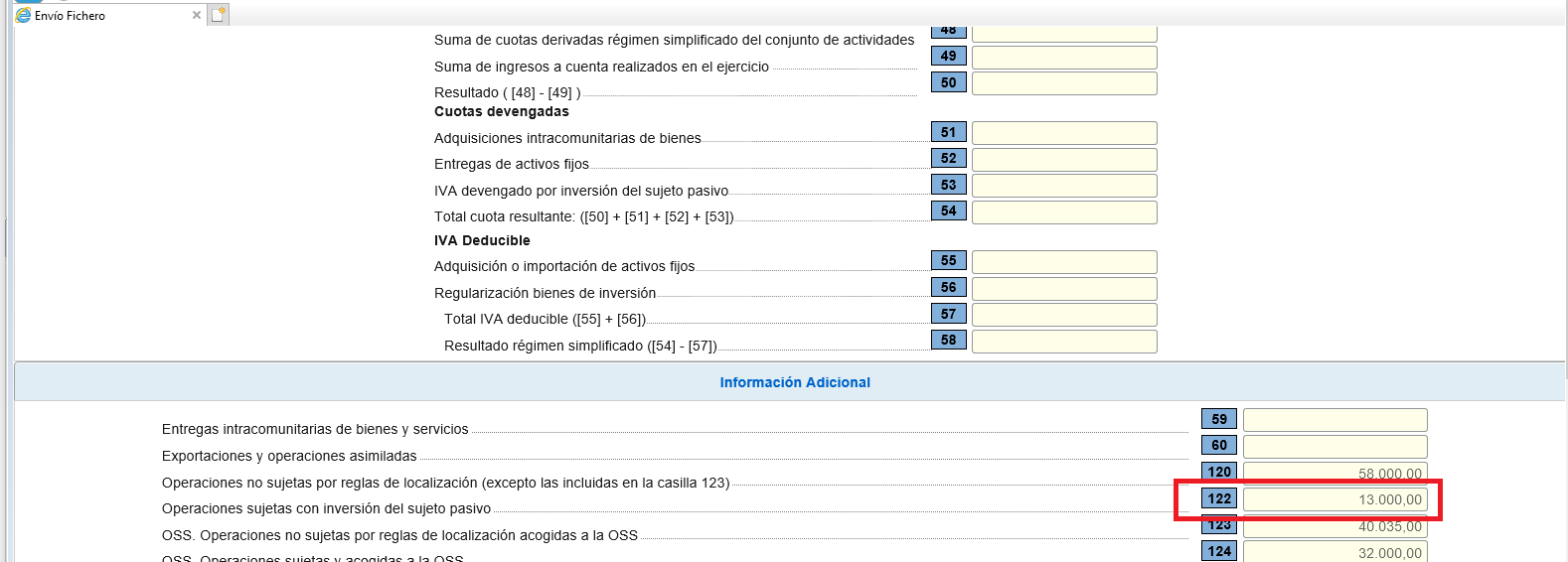| Proposed Solution | Cambios en la Pagina 3 (DP30303) Los espacios antes reservados para la AEAT ahora incluyen información, tal y como se indica a continuación: Posición 46 + 17 - Tipo Numérico - casilla [61] - Operaciones no sujetas o con ISP que orginan el derecho a deducción. Este parámetro de tipo output ya existente esta asociado a los siguientes impuestos: * Entregas sin IVA por ISP * Entregas sin IVA por ISP con RE * Servicios a Canarias, Ceuta y Melilla (%N=>0%) * Servicios a Canarias, Ceuta y Melilla (%R=>0%) * Servicios a Canarias, Ceuta y Melilla (%SR=>0%) * Servicios prestados internacional (%N=>0%) * Servicios prestados internacional (%R=>0%) * Entregas no sujetas con dcho a deducción * Servicios no sujetos con dcho a deducción A partir del ejercicio 07 no se debe cumplimentar, con lo cual hay que borrar de forma manual, el parámetro existente de esos impuestos, que pasarán a otras casillas. * Entregas sin IVA por ISP - Ver casilla 122 * Entregas sin IVA por ISP con RE - Ver casilla 122 * Servicios a Canarias, Ceuta y Melilla (%N=>0%) - Ver casilla 120 * Servicios a Canarias, Ceuta y Melilla (%R=>0%) - Ver casilla 120 * Servicios a Canarias, Ceuta y Melilla (%SR=>0%) - Ver casilla 120 * Servicios prestados internacional (%N=>0%) - Ver casilla 120 * Servicios prestados internacional (%R=>0%) - Ver casilla 120 * Entregas no sujetas con dcho a deducción - Ver casilla 120 * Servicios no sujetos con dcho a deducción - Ver casilla 120 Posición 63 + 17 - Tipo Numerico - casilla [120] - Operaciones no sujetas por reglas de localización Para rellenar esta nueva posición hay que crear un nuevo parámetro del 303 de tipo "Ouput", que se debe relacionar con los impuestos mencionados en el apartado anterior. Nombre del parámetro de tipo Ouput: [120] Ops. no sujetas por reglas de localización Además si la empresa no esta acogida a OSS, los impuesto de IVA de la Unión, deberán asociarse a este nuevo parámetro de forma manual, para que las bases de las transacciones asociadas a esos impuestos, vaya a la casilla [120]. Ver issue 47313 Posición 80+17 - continua siendo espacio reservado para la AEAT Posición 97+17 - Operaciones sujetas con inversión del sujeto pasivo (casilla 122) Para rellenar esta nueva posición hay que crear un nuevo parámetro del 303 de tipo "Output", que se debe asignar en el dataset a los impuestos que se listan a continuación: Entregas sin IVA por ISP Entregas sin IVA por ISP con RE Este nuevo parámetro se debe crear en el grupo "Liquidación - Resultado", con la siguiente información: SearchKey: SujetasConISP Nombre : Operaciones sujetas con inversión del sujeto pasivo Posición 114+17 . OSS. Operaciones no sujetas por reglas de localización acogidas a la OSS (casilla 123) Para rellenar esta posición hay que crear un nuevo parámetro de salida (Output) en la sección Liquidación - Resultado con los detalles siguientes: SearchKey: OSS_NoSujetaLocalizacion Nombre: OSS. Operaciones no sujetas por Reglas de Localización acogidas a la OSS (Ventanilla Única) Este parámetro se debe asignar de forma manual a los impuestos de IVA de la Union correspondiente, si la empresa esta acogida a OSS. Ver issue 47313 Posición 131+17 . OSS. Operaciones sujetas y acogidas a la OSS (casilla 124) Nuevo parámetro de entrada a rellenar por el usuario, que se debe crear en la sección de Liquidación - Resultado, con el nombre: [124] OSS.Ops Sujetas y acogidas a OSS Las posiciones a partir de esta, se deben crear como parámetros de entrada (a rellenar por el usuario) que sólo se deben mostrar en caso de Declaración marcada como "Devolución" e "Inscrito en el Régimen de Devolución". Estos nuevos parámetros se deben crear en la sección "Banco". Estos espacios antes estaba destinados a la AEAT, ahora quedan: Posición 485+70 - Banco (en el que la AEAT tiene que hacer la Devolución) Posición 555+35 - Dirección el banco Posición 590+30 - Ciudad del banco Posición 620+2 - Codigo ISO (dos posiciones) del país Posición 622+1 - Marca SEPA (posibles valores: 0=vacia 1=cuenta España 2=Union Europea SEPA 3=Resto Países | |||||||
