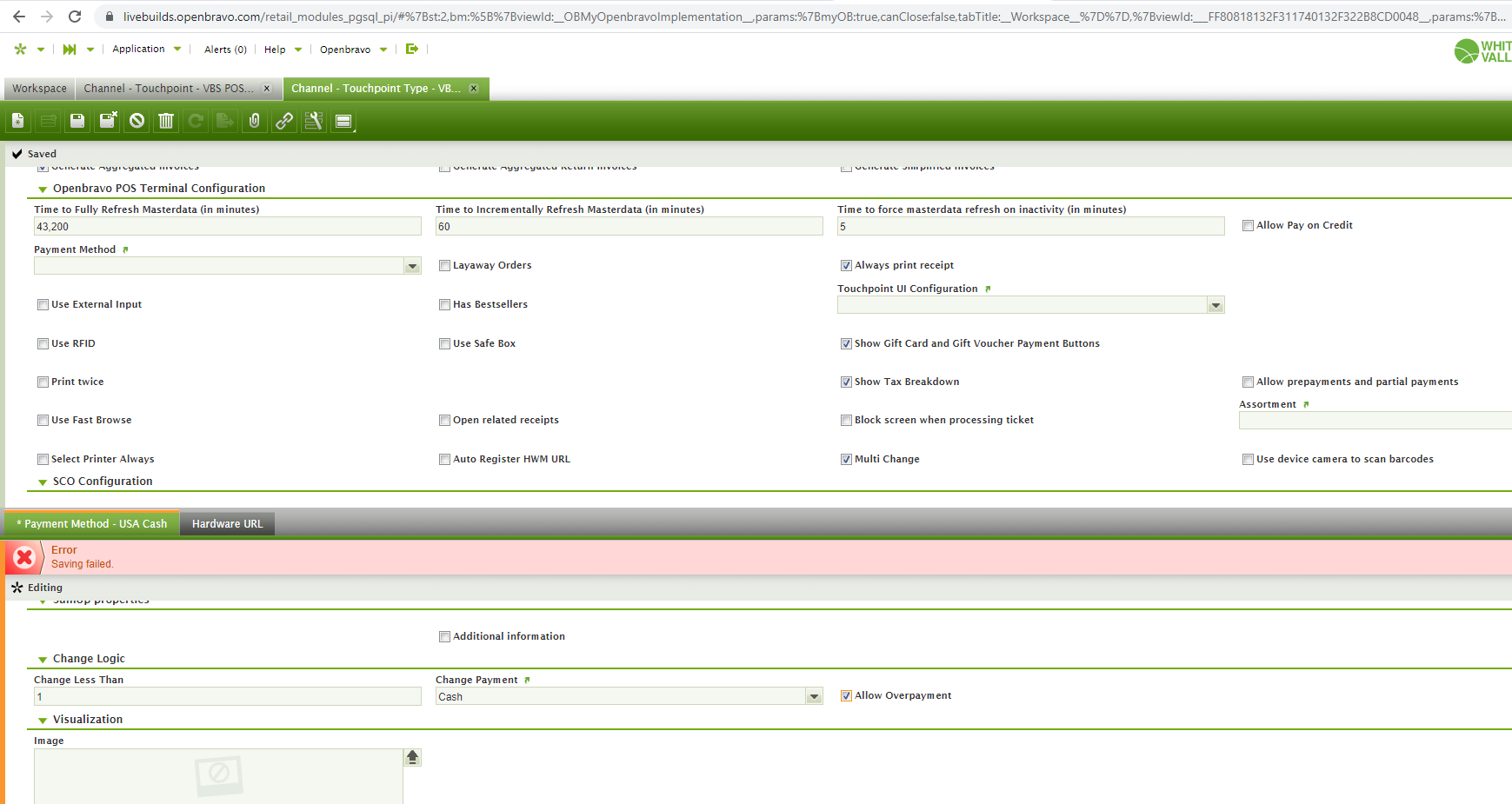 The step to reproduce in livebuilds is : - Log into backoffice - Go to the window ‘Channel - touchpoint type’ - Select the recrod ‘VBS POS Terminal Type’ - Active the checkbox ‘Multi change’ - On the subtab ‘Payment Method’, Select the payment method 'USA Cash' - Go to the line change logic - Put 1 in the field ‘Change Less Than’ and choose the ‘Change Payment’ 'Cash' |