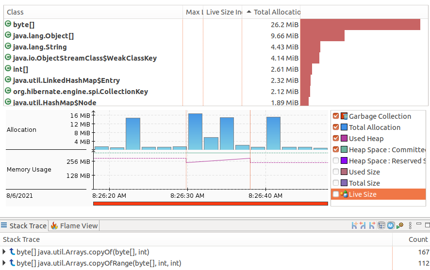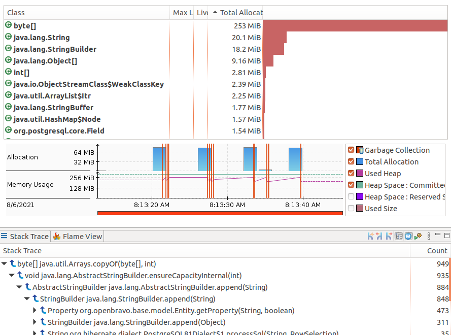 | Steps To Reproduce | 1. Start recording with JDK Mission Control's Flight Recorder [1] 2. Ie. in POS create 4 time a ticket with 4 product and pay it 3. Check Flight Recorder results. -> It warns about byte[] allocation in Allocated Classes section -> In Memory details (see attached no-fix.png) check a total of ~250MB byte[] where allocated, checking the stack traces, it can be seen the main contributor for this allocation is Entity.getProperty. [1] https://www.oracle.com/java/technologies/jdk-mission-control.html [^] | |||||||
