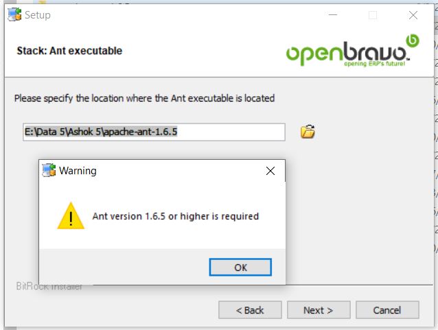 Hello dhammani, There is no windows installer for Openbravo at least not for the last 8-10 years or so. Looking at ant-version + java-version looks like you may have some some very very old download link which would make any sense to use today. Please add info here where you found the outdated info so it can be reviewed (and probably removed). |