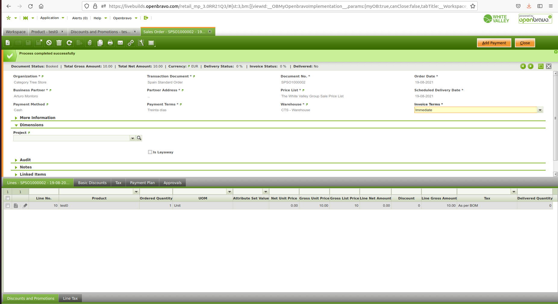 | Steps To Reproduce | In https://livebuilds.openbravo.com/retail_mp_3.0RR21Q3 [^] In the Product window set a test product (with "Is Generic" selected) and in the Price tab set a price. In the Characteristics tab set two characteristics for the product (such as Diameter and Dynafit System, with "Variant" selected). Press the "Manage Variants" button to create a variant of the product (for example the one with Dynafit System: Yes, Diameter: 7.3 mm). In the Discounts and Promotions window set a test discount with Discount/promotion type = Price Adjustment, Starting Date and Included Characteristics = All of the values defined. In the Include Characteristics tab set the two characteristics of the product. In the Sales Order window create a new sale order with the product in the Lines tab. Book the sale order and check that the discount hasn't been applied. In the Excluded Characteristics repeat the last steps to check that All of the values defined doesn't apply the discount if any of the characteristic is defined instead of if all of the characteristics are defined. See the attached images and an example video: https://drive.google.com/file/d/1QlWzAEZ5BefOD-PQukr5Gdgrn1U86c_8/view?usp=sharing [^] | |||||||