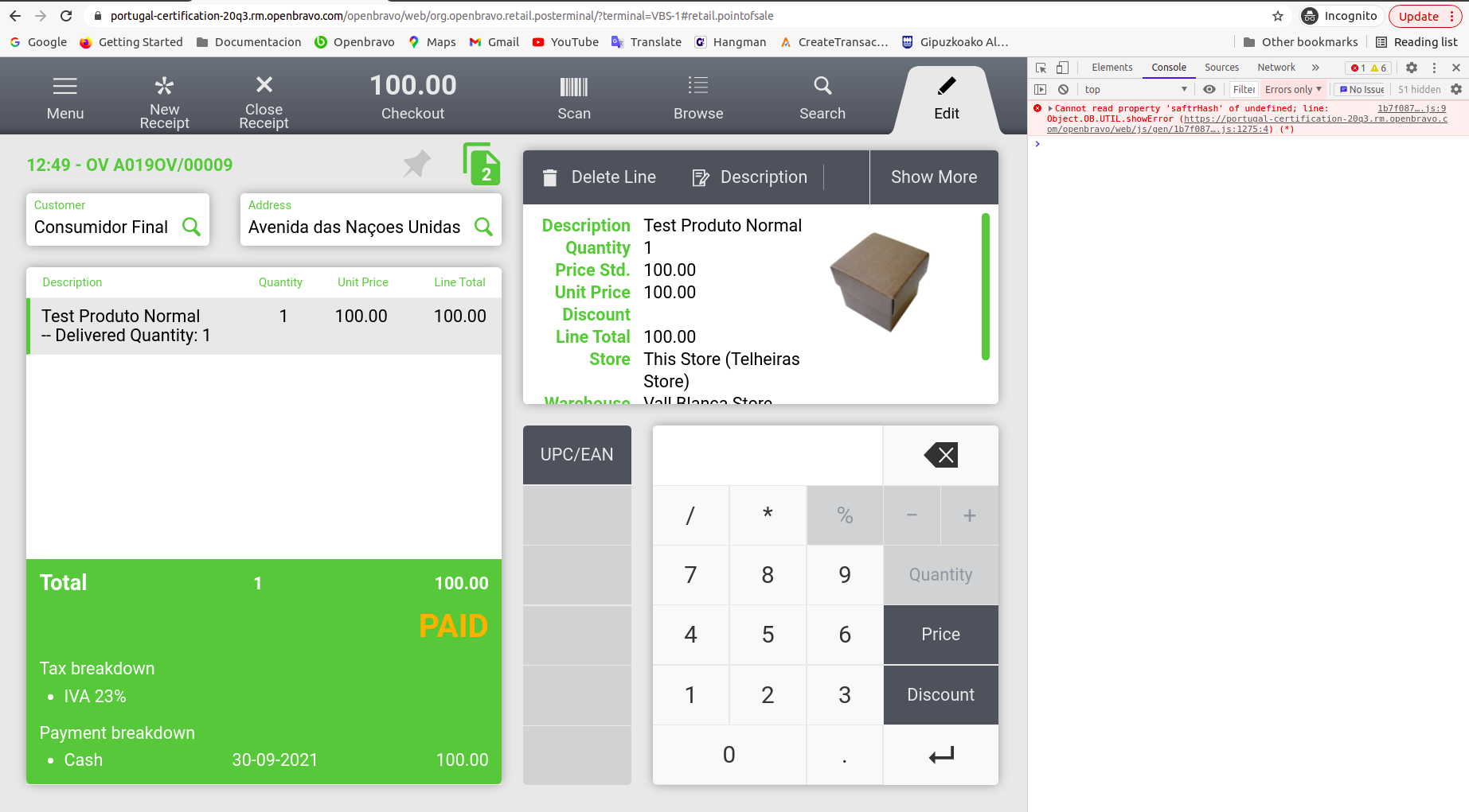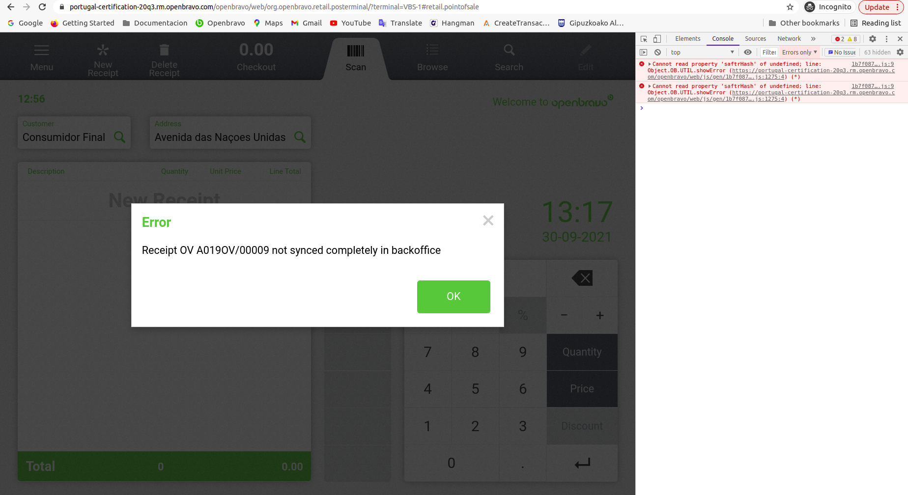 From the menu, select once more the option "Open Receipt" and once more the receipt/sale just created. Another error is shown. See image "Error_notSyced"