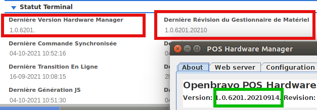 | Steps To Reproduce | Compile the Hardware Manager to have a version, for instance, 1.0.6201.20210914 select terminal_lasthwmversion, terminal_lasthwmrevision, value from obpos_applications order by updated desc You will only see: terminal_lasthwmversion= 1.0.6201. terminal_lasthwmrevision = 1.0.6201.20210 and same in backoffice, see image attached | |||||||