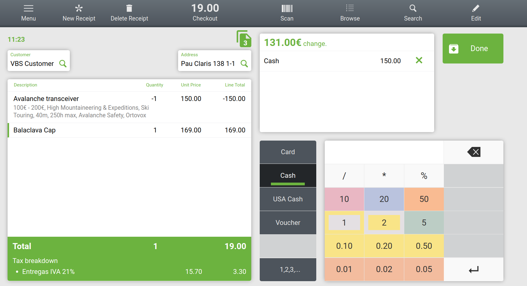 Step 4: Again select the total amount(19€) and add the payment, it will show change as 131€ and cash as 19€.
