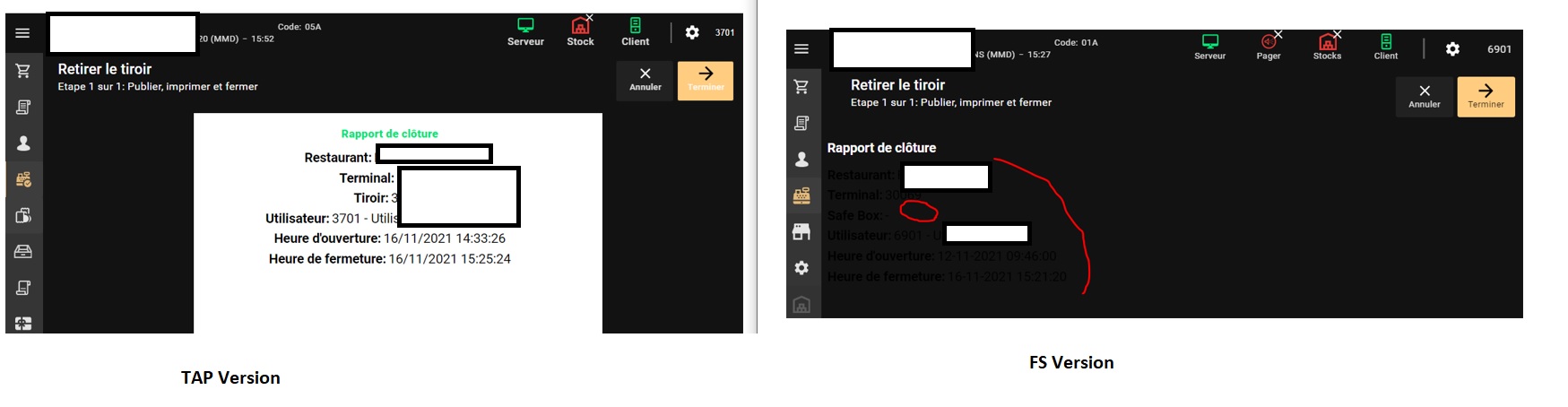 | Steps To Reproduce | Test steps: 1. Open the url https://agapes-fullscope.services.openbravo.com/openbravo/web/pos/ [^] 2. log in with a cashier account and validate 3. Create some tickets and pay for it 4. Click on the button Fermer la caisse => A title for the till closure is displayer : Retirer le tiroir => OK A closure report is displayed with the following informations : Restaurant, Terminal, Tiroir, Utilisateur, Heure d'ouverture, Heure de fermeture => KO ==> 1. IT must be Tiroir instead of safebox 2. There is no information displayed for the safebox 3. The report seems invisible We can see clearly the difference between the environment test and fullscope in the file attached | |||||||