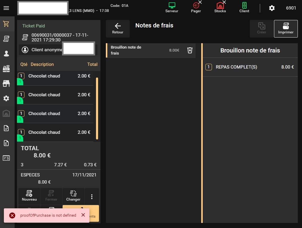 | Steps To Reproduce | Test steps: 1. create a sale and pay 2. Click on Derniere note de frais 3. Click on Créer 4. Choose Renseigner le montant 5. Click on Générer 6. Select the draft and click on Imprimer Sélection => ProofOfPurchase is not defined. | |||||||