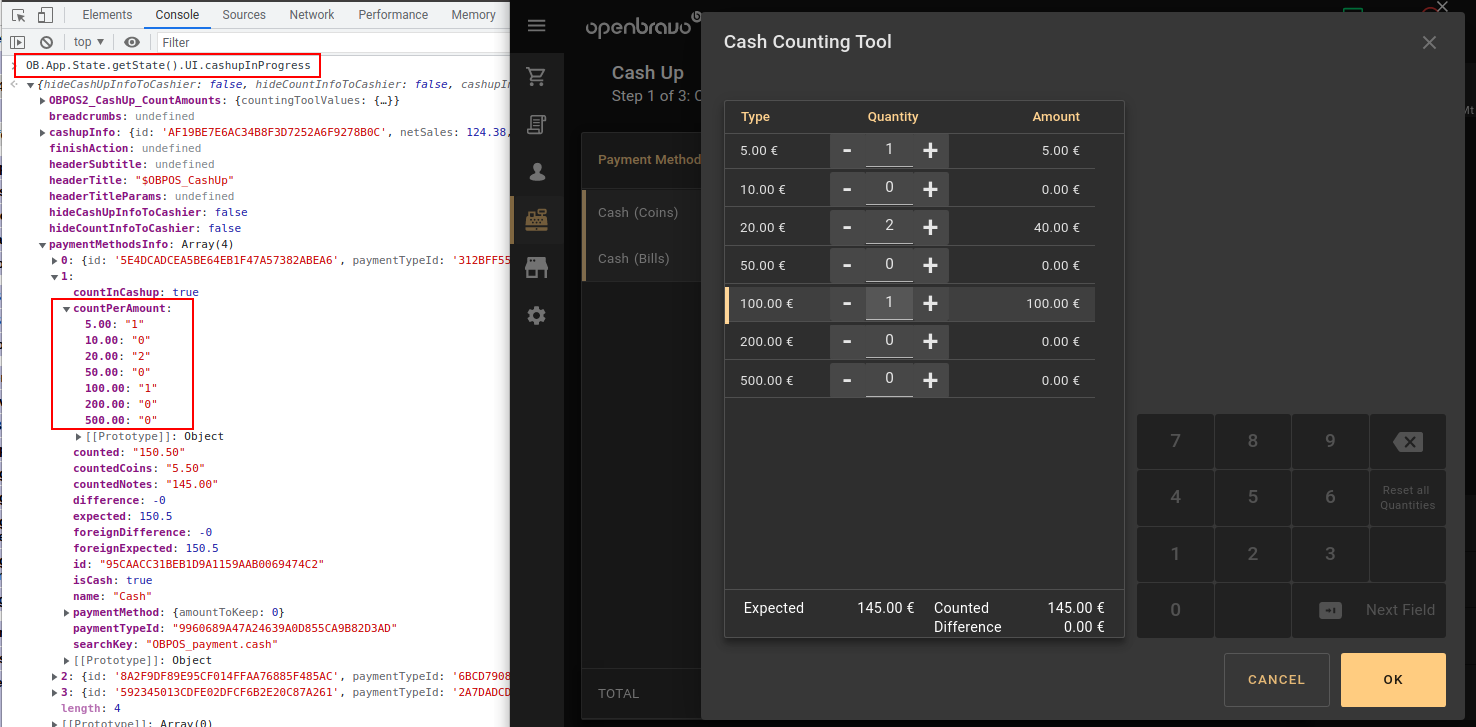 | Steps To Reproduce | 1. IN BO: Configure coins and notes for EUR currency 2. Login in POS2 3. Select a Safebox to make Initial Count 4. Select the payment method and push button "Split Coins&Notes" 5. Count the coins. Check in the state that the count of the coins is proper: OB.App.State.getState().UI.cashupInProgress.paymentMethodsInfo[X].countPerAmount 6. Now count the notes. Check in the state that the coin count was lost, now only the note count is included | |||||||