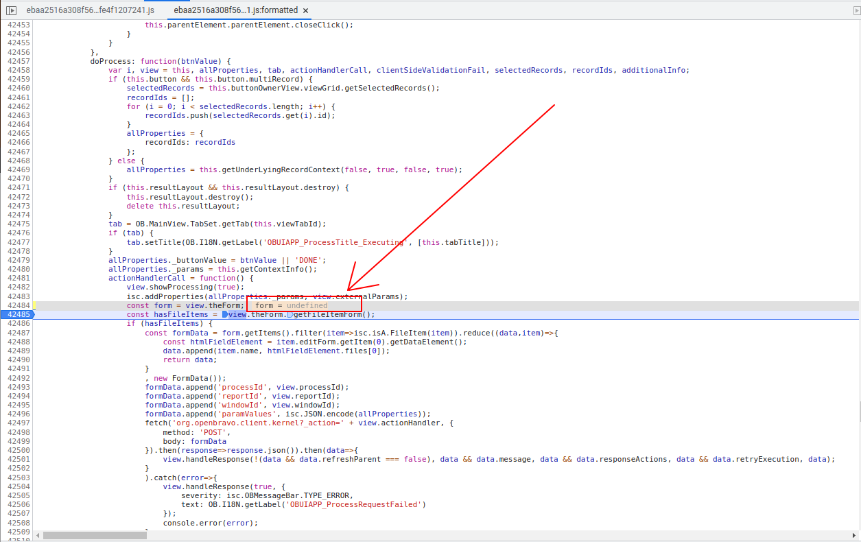 Directly closing issue as related merge request is already approved. Repository: https://gitlab.com/openbravo/product/openbravo [^] Changeset: b0b226d8dd680eefa424e160ac25913b3a8a4956 Author: Augusto Mauch <augusto.mauch@openbravo.com> Date: 12-01-2022 15:27:35 URL: https://gitlab.com/openbravo/product/openbravo/-/commit/b0b226d8dd680eefa424e160ac25913b3a8a4956 [^] Fixes ISSUE-48387: Cannot execute standard process with no parameters A regression was introduced in this changeset [1] and as a result the execution of standard process that do not have any parameters fail, because the property theForm of those processes is not defined. It has been fixed by making sure the form exists before invoking its getFileItemForm method. [1] https://gitlab.com/openbravo/product/openbravo/-/commit/71dbcf0c4f6e2411cec063fd07f3e102abf462fd [^] --- M modules/org.openbravo.client.application/web/org.openbravo.client.application/js/process/ob-parameter-window-view.js --- |