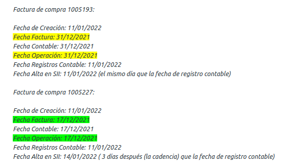 | Description | El problema sucede con facturas con distinto periodo que deberian enviarse en el mismo día de la fecha del registro contable. Si el proceso de envio automatico se ejecuta el día X a las 18:00 y después ese mismo día se crea una fecha con registro contable con ese mismo día. El proceso del día siguiente no envía esa factura y se respeta la cadencia. Lo mismos pasa si tenemos una factura con fecha de registro contable el día X pero sin completar a las 18:00 y en ese momento se ejecuta el proceso de envio al SII. Al completarla ese mismo día más tarde o al dia siguiente, tampoco se envia en el siguiente envio automatico del SII, sino que respeta la cadencia. | |||||||||||