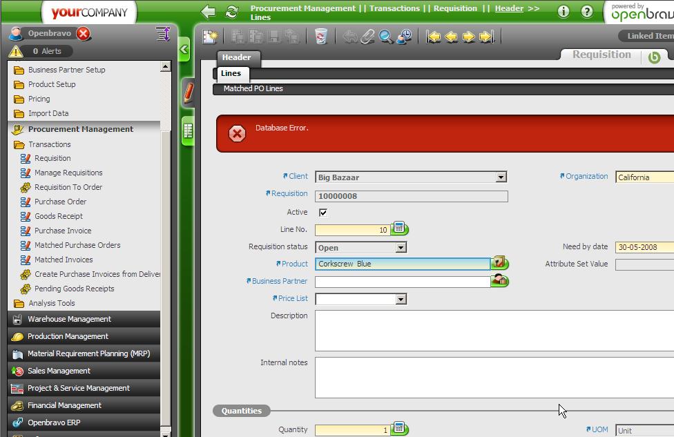 | Steps To Reproduce | Go to Procedurement Management->Transactions:Requisition. Create new header, complete the compulsary fields, save. Later go to Lines inside it and create a new line, save. Then you have to create a new header with a different business partner save it, finally create a new line and try to save it, a Database error appears. | |||||||