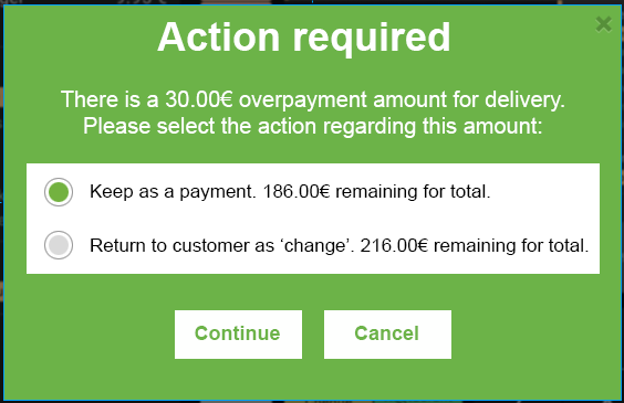 | Description | These feature should also be added in POS2 application. The requirement affects only for Prepayment functionality and when Web POS Generate Change with Prepayments preference is configured to Y When adding a cash payment that exceeds not only the prepayment amount but also the total ticket amount, the popup to indicate what to do with the overpayment should be shown. In this case, the popup should allow you to do one of these two options 1. Keep some amount as payment and return to the customer some other amount as change 2. Return the whole overpayment amount as change | |||||||||||