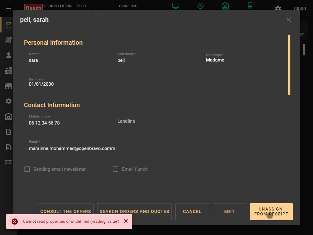 | Steps To Reproduce | go to webpos  and log in with cashier account 6900/6900 (terminal 69_03) Click on CLient Lens Search 1402003499185 by Identifier No and launch the research fro all the restaurants Click on the customer > View info Click on Edit and modify the name Save the change Now click on unassign from receipt ==> obtained result : Cannot read properties of undefined (reading 'value'); ==> expected result : The customer is unassigned | |||||||