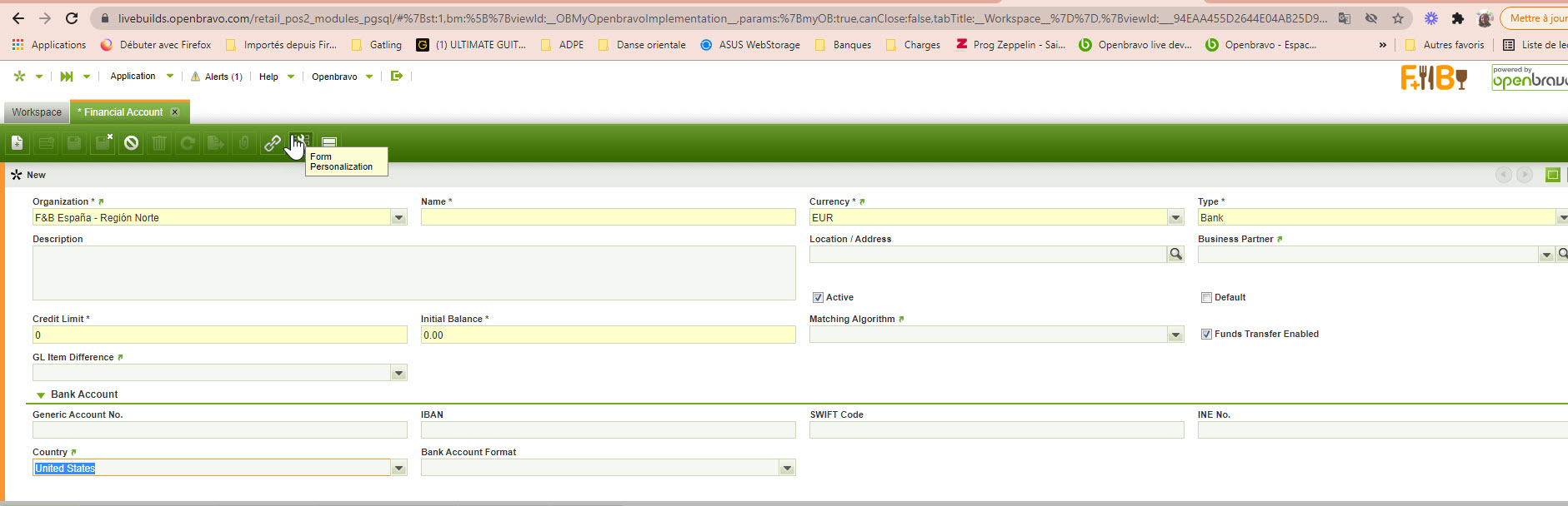 | Steps To Reproduce | In Financial Account Tab, click on create a new record by a form. Expected result : the field country is empty Obtained result : the field is filled with United States | |||||||