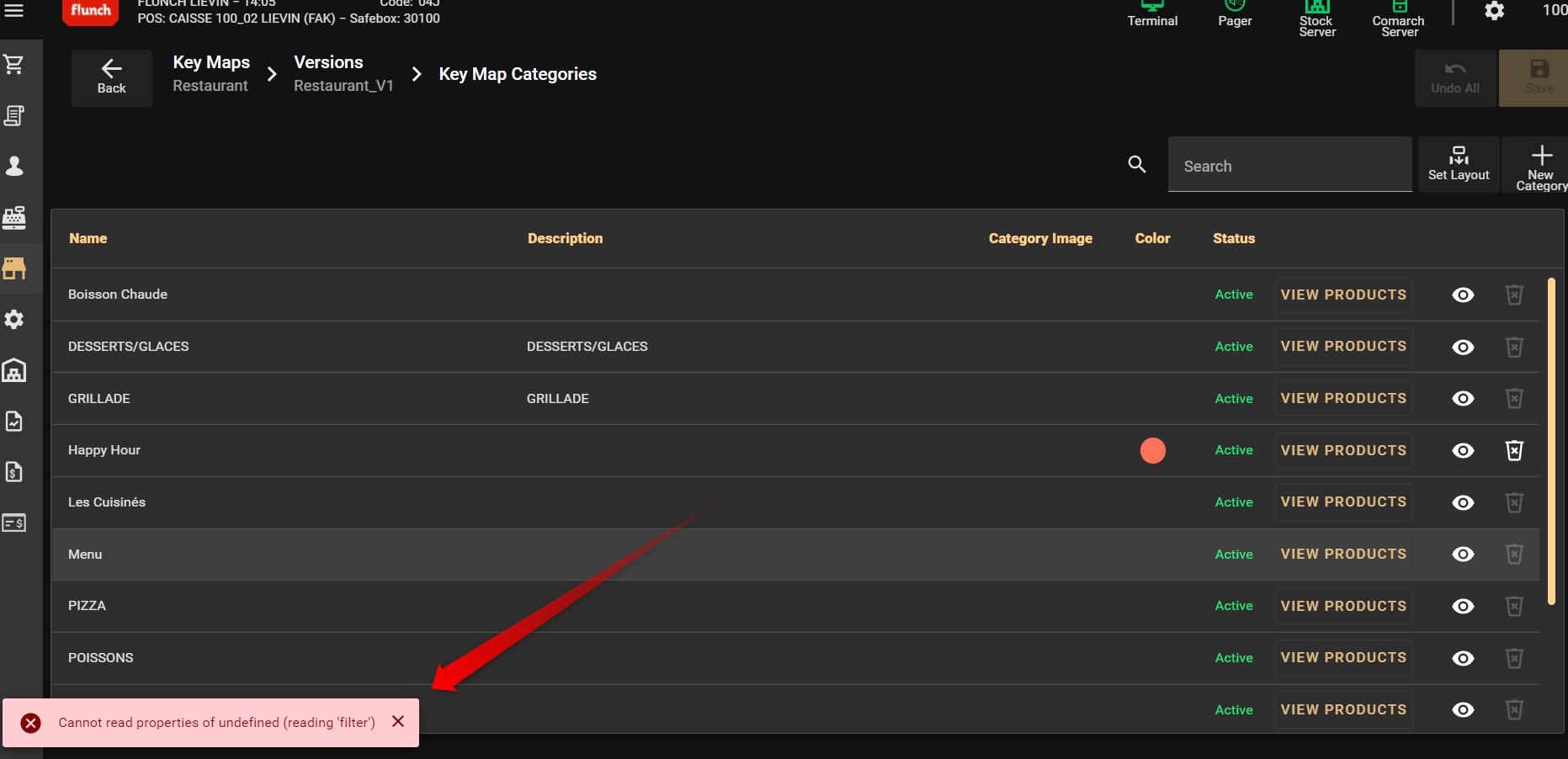 | Steps To Reproduce | - Go on POS - Go on Keymap editor - Chose a category and click a "View version" - Click on the "eye" icon to edit a category - Try to disable a menu for exemple "Happy hour" - Ckick on ok then save -See the error message (If you want to make a change in the key map editor, you need to configure it as "Manual" in the back office in the section "Keymap" | |||||||