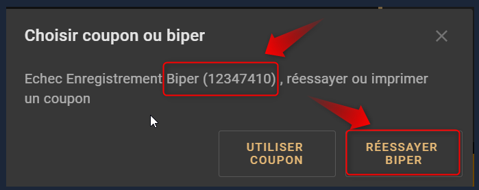 | Description | When a product in configured in "Counter" ex : Steack hache Bouchere When we would like to paid for it, we have an error message is display =>Fail to register to the biper (12349990), use coupon // Retry using biper (See picture) This error message is fals, (it's not a biper, but a counter) We whould have instead : => Fail to reggister to the Counter, Use coupon // Retry using Counter | |||||||